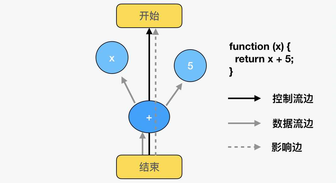 首先我们可以看一下SoN的结构,整个的SoN只有节点和边构成。除了值以外,所有的运算也都是用节点来表示的。在TurboFan的可视化工具Turbolizer中,使用了不同颜色来区分不同类型的节点。浅蓝色就代表了值,深蓝色代表了中间层的操作,例如运算。就像下面的加法运算,边是用来表示运算之间的依赖关系,表达的是5+x。这种依赖也就限制了先后顺序,比如5+x的加法运算是依赖5和x两个值节点的,所以我们在顺序上可以允许5和x是先后关系,但是必须出现在加法运算前。