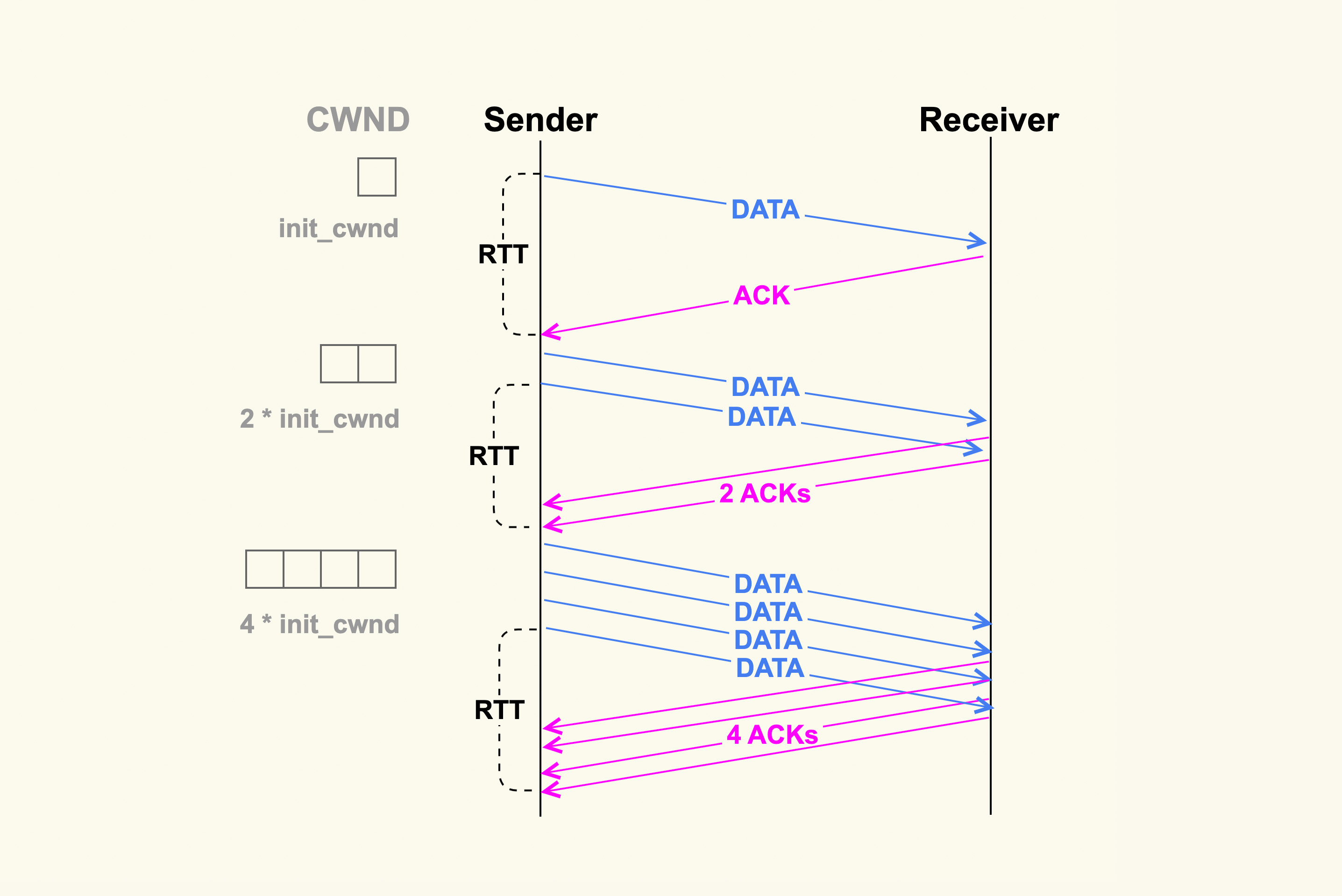 TCP连接建立好后,发送方就进入慢速启动阶段,然后逐渐地增大发包数量(TCP Segments)。这个阶段每经过一个RTT(round-trip time),发包数量就会翻倍。如下图所示: