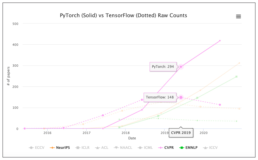从学术界来看,2019年之前,TensorFlow还是各大顶会论文选择的主流框架,而2019年之后,顶会几乎成了PyTorch的天下,此消彼长,PyTorch只用了一年的时间。