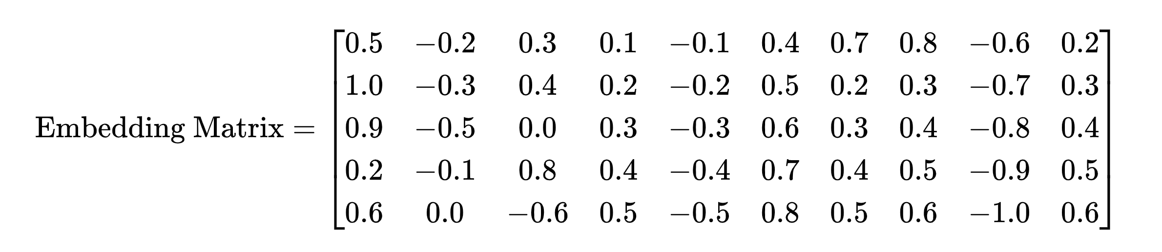 基于这些知识,我们再来梳理一下参数的含义,还是以embedding层来解释,我们举一个小一点的例子,用5*10的矩阵来讲。