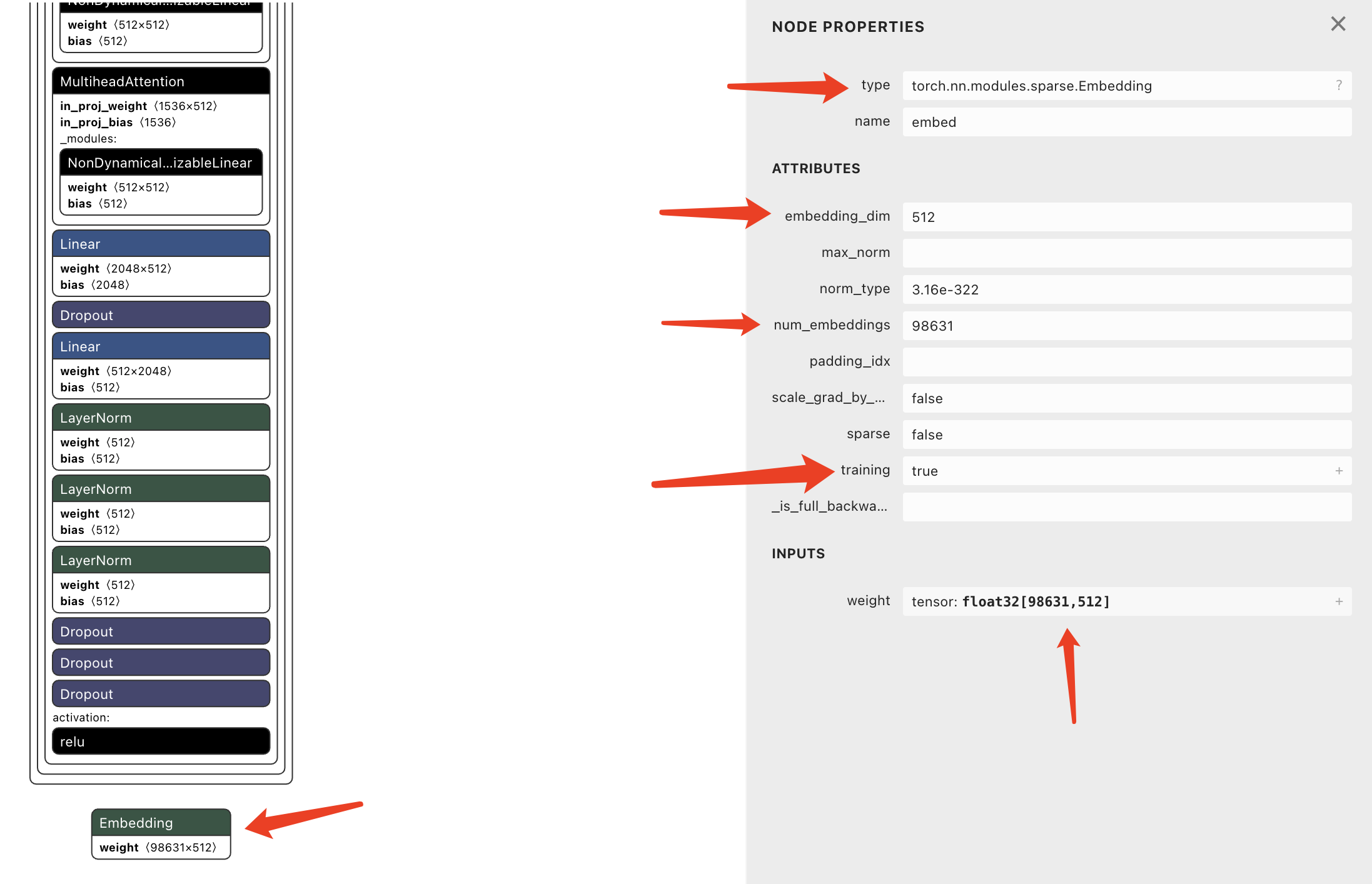 点击第一个Embedding节点,右边会展示这个节点的详细信息。