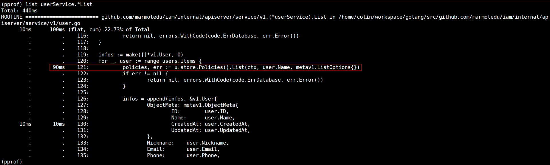 再观察采样图,可以看出v1.(*userService).List耗时久是因为调用了fake.(*policies).List函数。我们也可以通过list命令查看函数内部的耗时情况: