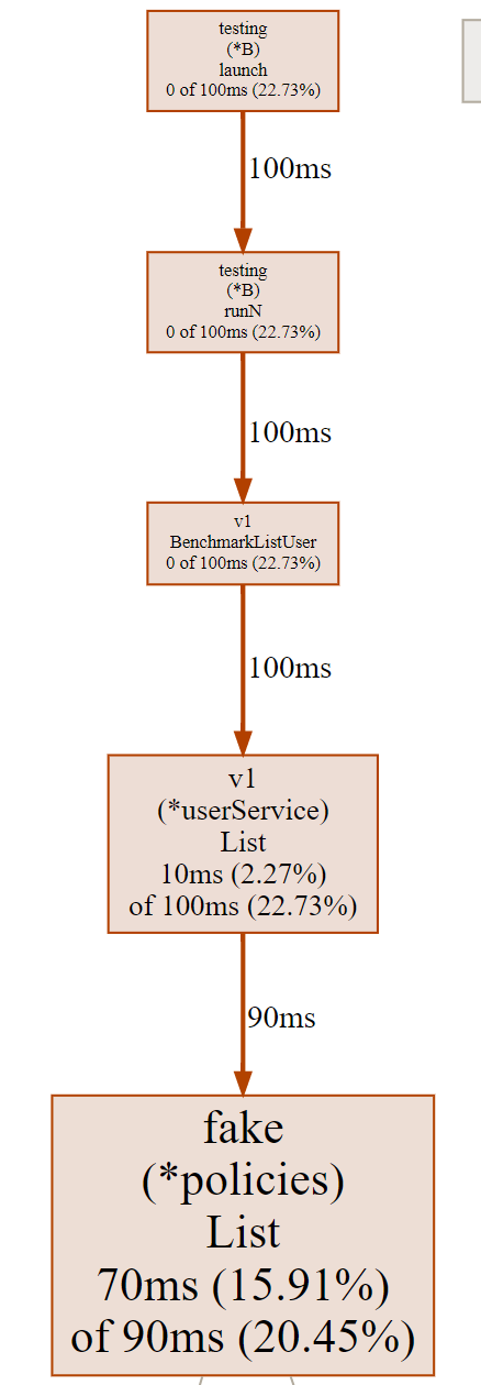线段旁边的数字90ms则说明,v1.(*userService).List调用fake.(*policies).List函数,在采样周期内,一共耗用了90ms。通过函数调用关系,我们可以知道某个函数调用了哪些函数,并且调用这些函数耗时多久。