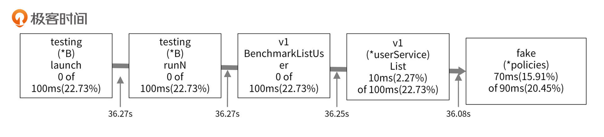 现在问题找到了,那我们怎么优化呢?你可以利用CPU多核特性,开启多个goroutine,这样我们的查询耗时就不是串行累加的,而是取决于最慢一次的fake.(*policies).List调用。优化后的v1.(*userService).List函数代码见internal/apiserver/service/v1/user.go。用同样的性能测试用例,测试优化后的函数,结果如下: