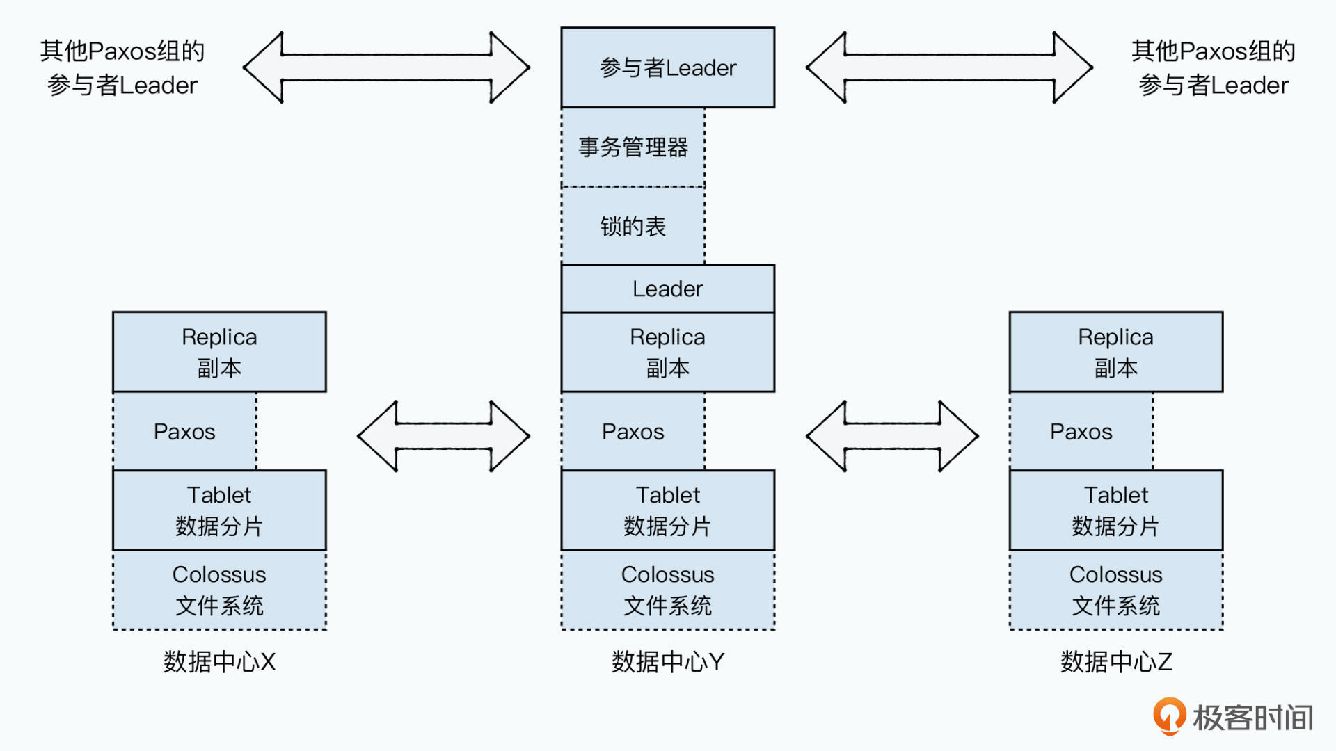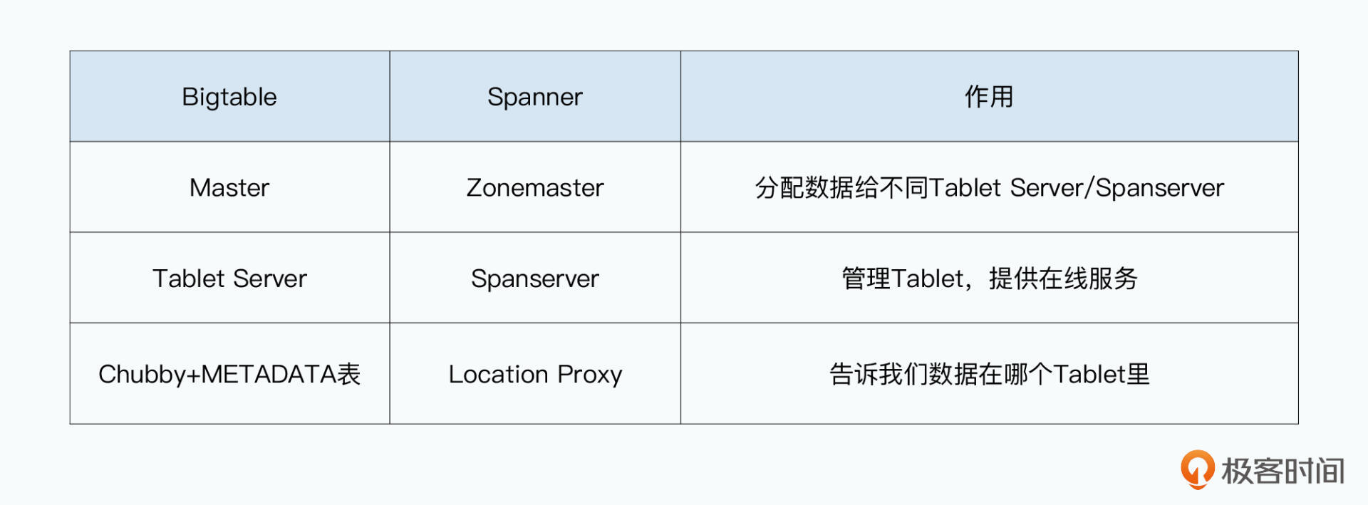 其实这个组合和我们之前学习的Bigtable非常类似。Zonemaster就好像Bigtable里的Master节点,负责分配Tablet;Spanserver就好像Tablet Server,负责提供数据和在线服务。而Location Proxy则是新出现的节点,它承担了原先Chubby和METADATA表的功能。