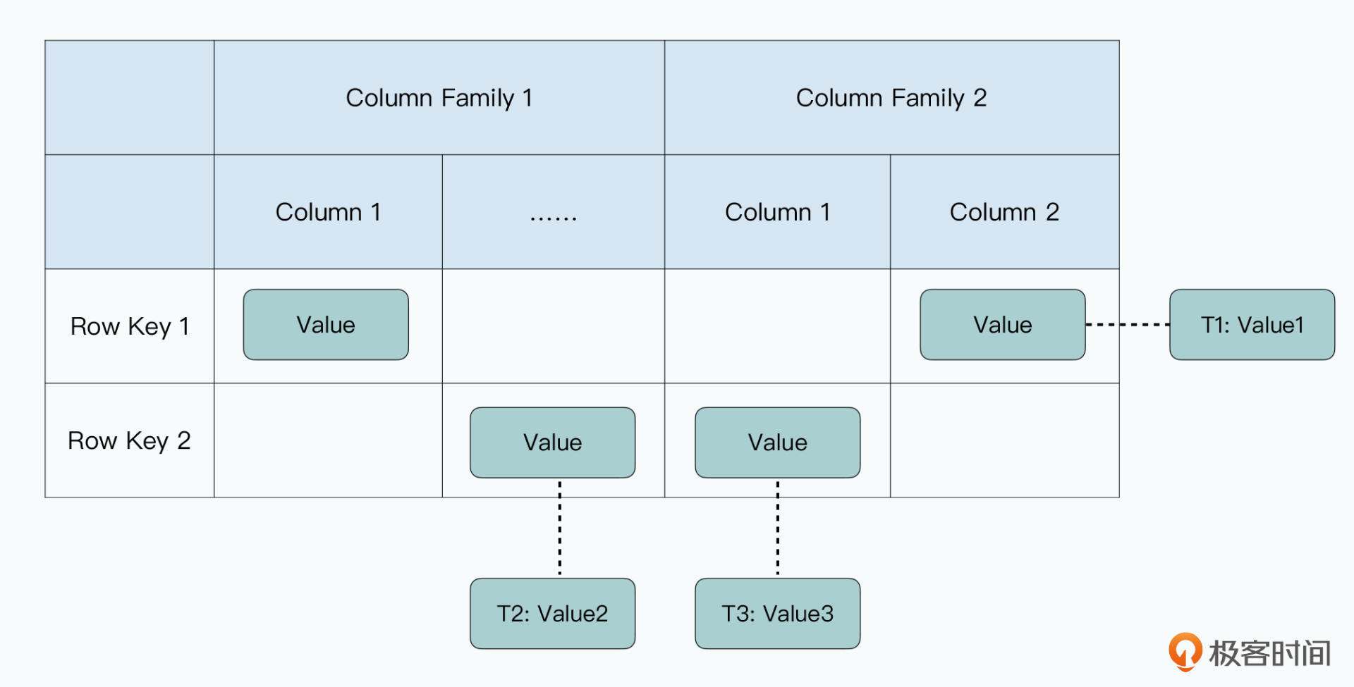 而不像是Bigtable那样,会把列族(Column Family)和Column(列)也放到映射关系的时间戳之前。