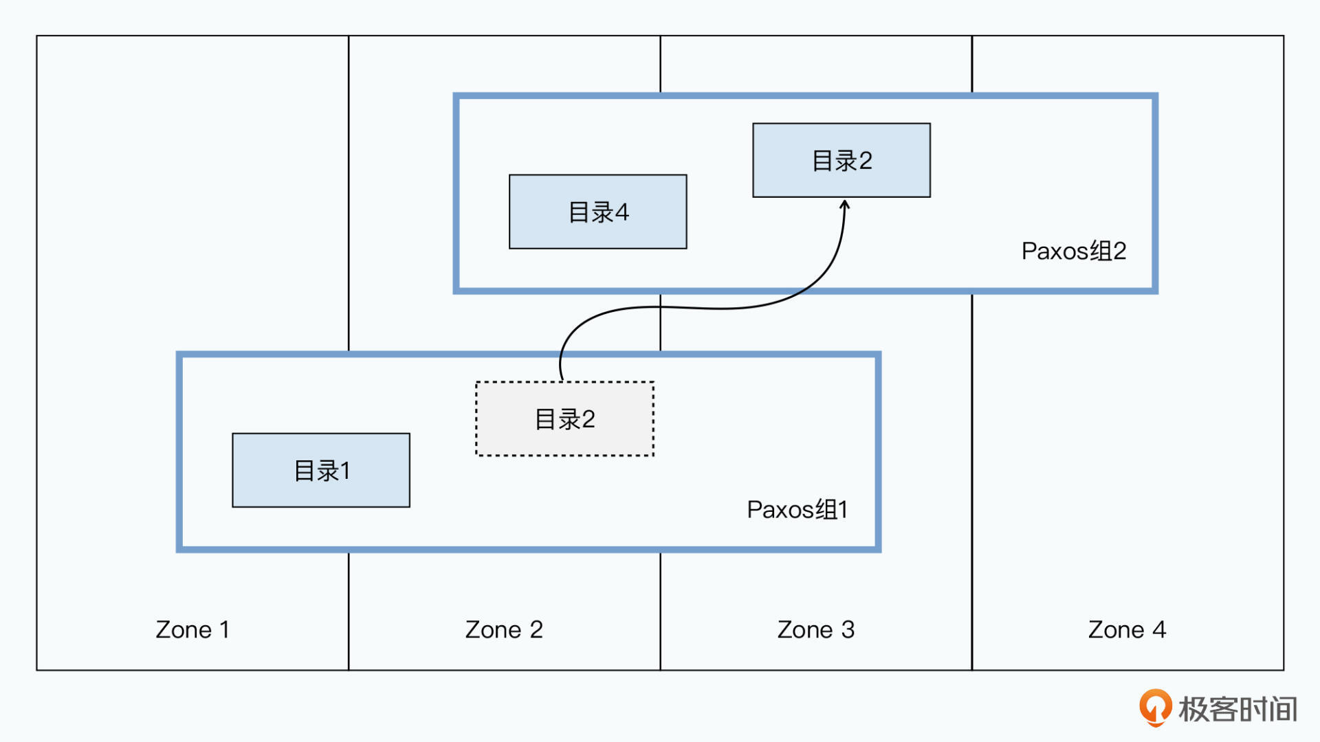 不过,Spanner的数据调度,并不是一条条记录去调度的,而是一小片一小片连续的数据去进行调度的。一小片连续的行键,在Spanner中被叫做是一个“目录”(Directory)。我们去调度数据的时候,是一个一个目录地调度。而一个Paxos组里,会包含多个目录。