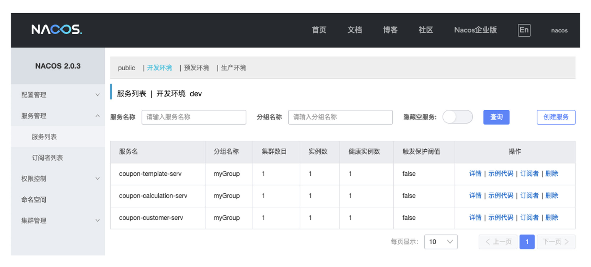 到这里,我们整个Nacos服务改造就已经完成了。你可以在本地依次启动coupon-template-serv、coupon-calculation-serv和coupon-customer-serv。启动成功后,再到Nacos控制台查看这三个服务是否已经全部注册到了Nacos。