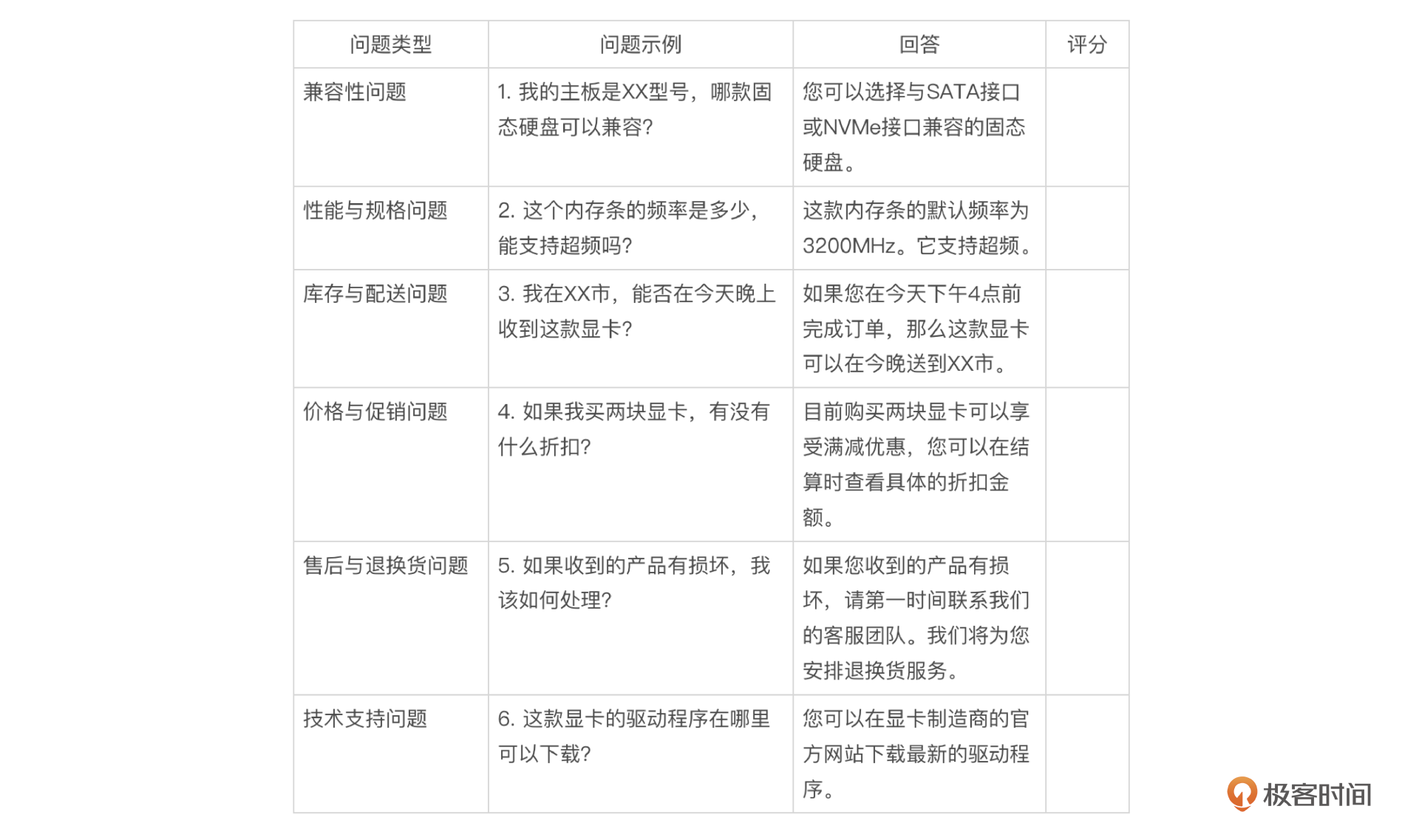 如果这3个测评非要做一个重要性排序的话,那么人工测评其实是最重要的。人工测评的方法是将智能客服项目最关心的能力设计为一系列问题,把问题和期望的回答写到Excel表格中,由人工挨个根据微调后的大模型进行评分。