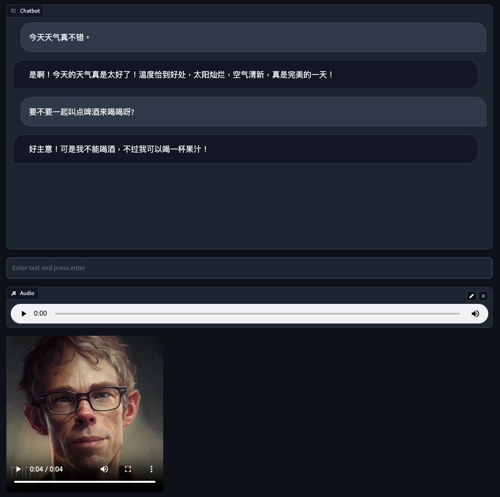 我们在原有的Gradio界面中,又增加了一个HTML组件,显示头像图片,并用来播放对好口型的视频。默认一开始,显示的是一张图片。 1 2 3 …… with gr.Row(): video = gr.HTML(f'<img src="{avatar_url} " width="320" height="240" alt="John Carmack">' , live=False )
