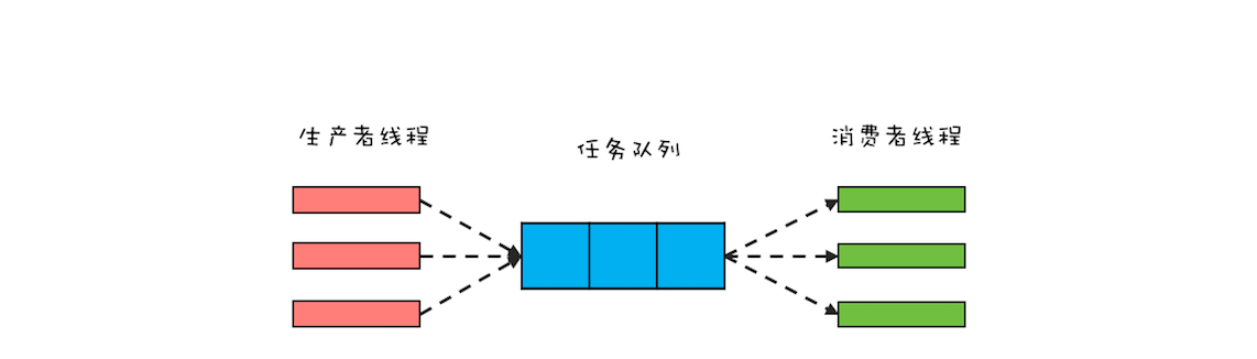 生产者-消费者模式的核心是一个任务队列,生产者线程生产任务,并将任务添加到任务队列中,而消费者线程从任务队列中获取任务并执行。下面是生产者-消费者模式的一个示意图,你可以结合它来理解。
