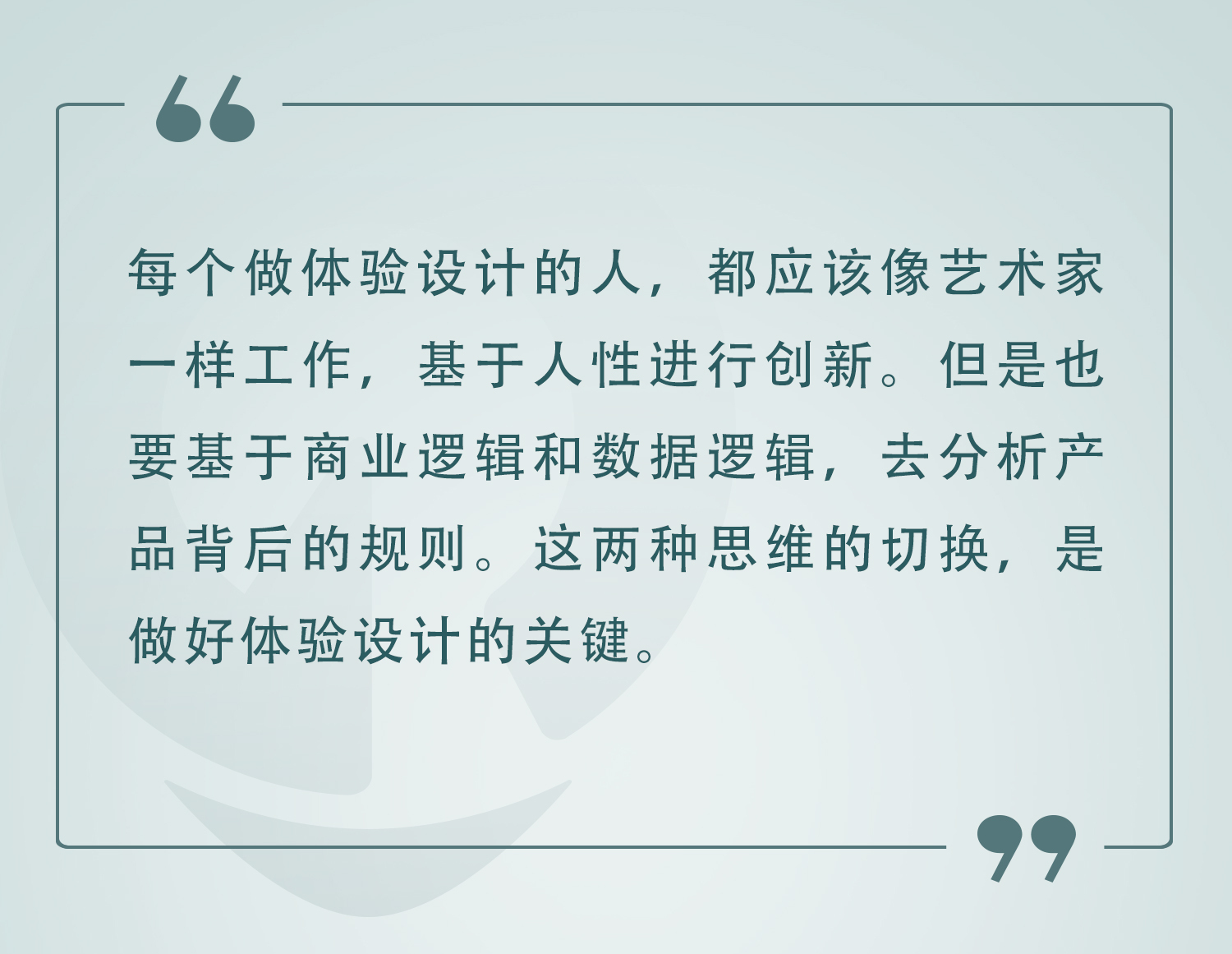 所以每个做体验设计的人,都应该像艺术家一样工作,基于人性进行创新。但是也要基于商业逻辑和数据逻辑,去分析产品背后的规则。这两种思维的切换,是做好体验设计的关键。