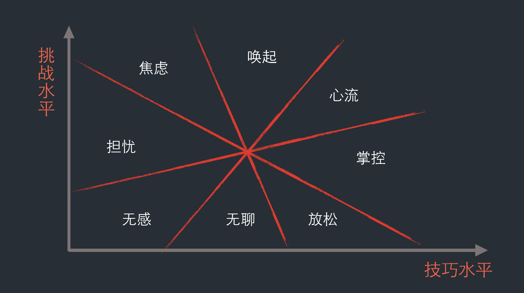 **唤醒区域:**当技能水平因为挑战而不断地提升,就会出现成长的感觉,这也更像是一种自身被唤醒的感觉。比如,学习某种语言会有很高的难度,但我们知道提升的路径,可以通过锻炼学习的技巧去达到,从而就会进入激励区域。这样就是一个很好的正向循环。