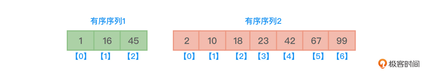 图1是两个有序序列(数组),现在我们希望利用归并排序把这两个数组合并成一个元素按从小到大排序的数组。