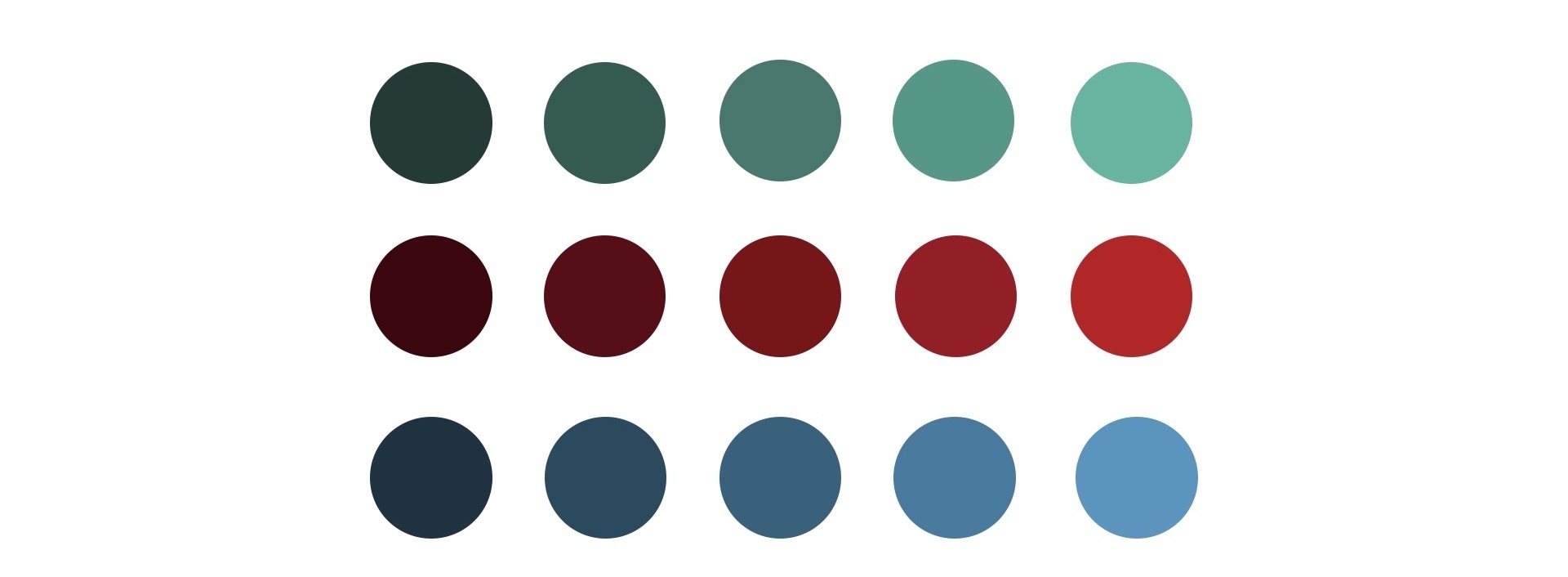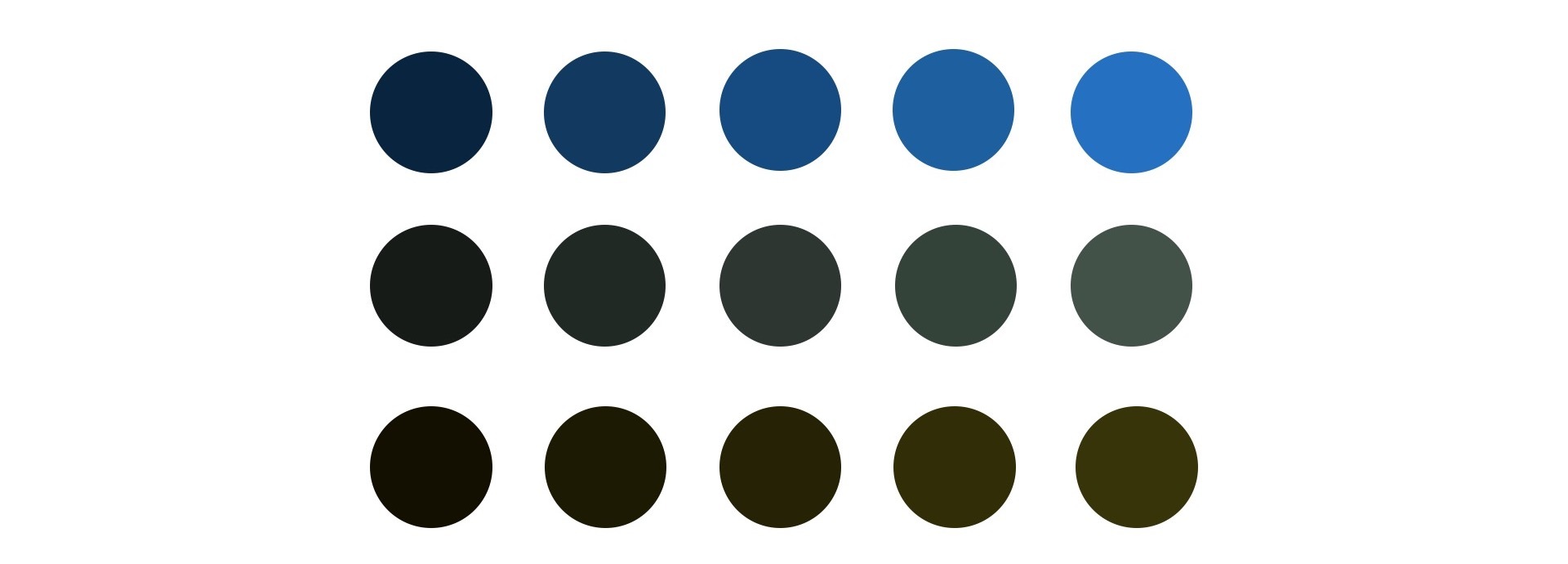 但是,这么做有两个缺点:首先,因为这个例子里的RGB颜色是随机产生的,所以行与行之间的颜色差别可能很大,也可能很小,我们无法保证具体的颜色差别大小;其次,因为无法控制随机生成的颜色本身的亮度,所以这样生成的一组圆的颜色有可能都很亮或者都很暗。比如,下图中另一组随机生成的圆,除了第一行外,后面两行的颜色都很暗,区分度太差。
