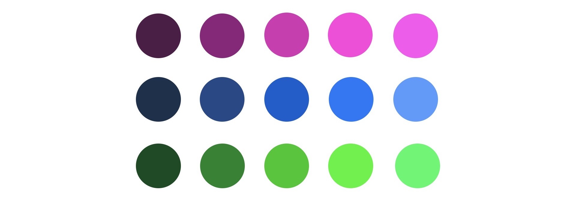 通过执行上面的代码,我们生成随机的三维向量,然后将它转成RGB颜色。为了保证对比,我们在每一组的5个圆中,依次用0.5、0.75、1.0、1.25和1.5的比率乘上我们随机生成的RGB数值。这样,一组圆就能呈现不同的亮度了。总体上颜色是越左边的越暗,越右边的越亮。得到的效果如下: