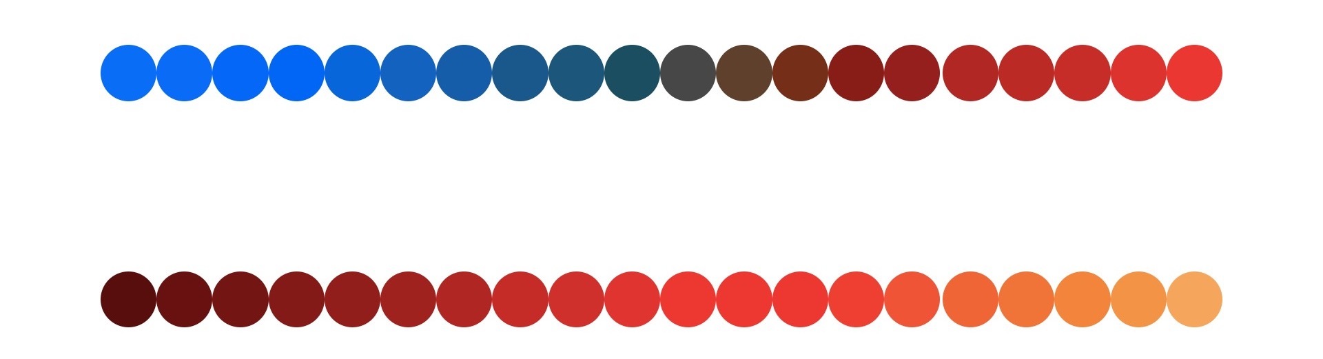 如上面代码所示,我们绘制两排不同的圆,让第一排每个圆的色相间隔都是15,再让第二排圆的颜色在色相60和210附近两两交错。然后,我们让这两排圆的饱和度和亮度都是50%,最终生成的效果如下: