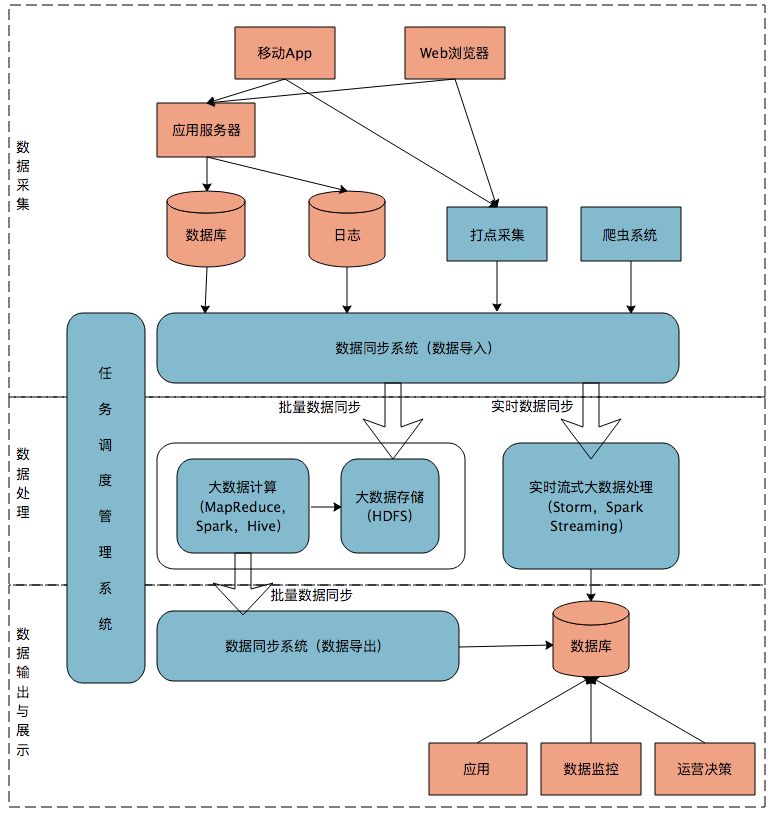 将应用程序产生的数据和日志等同步到大数据系统中,由于数据源不同,这里的数据同步系统实际上是多个相关系统的组合。数据库同步通常用Sqoop,日志同步可以选择Flume,打点采集的数据经过格式化转换后通过Kafka等消息队列进行传递。