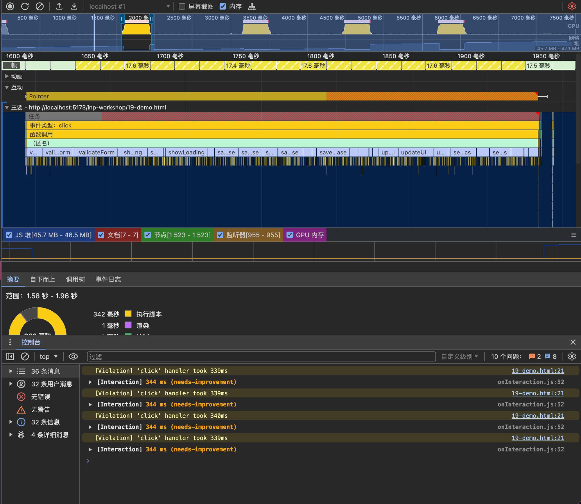 我们模拟这5个函数的执行,并通过在页面实时输出INP指标、交互数值、FPS帧数和当前运行时长等4个指标来观察性能情况。