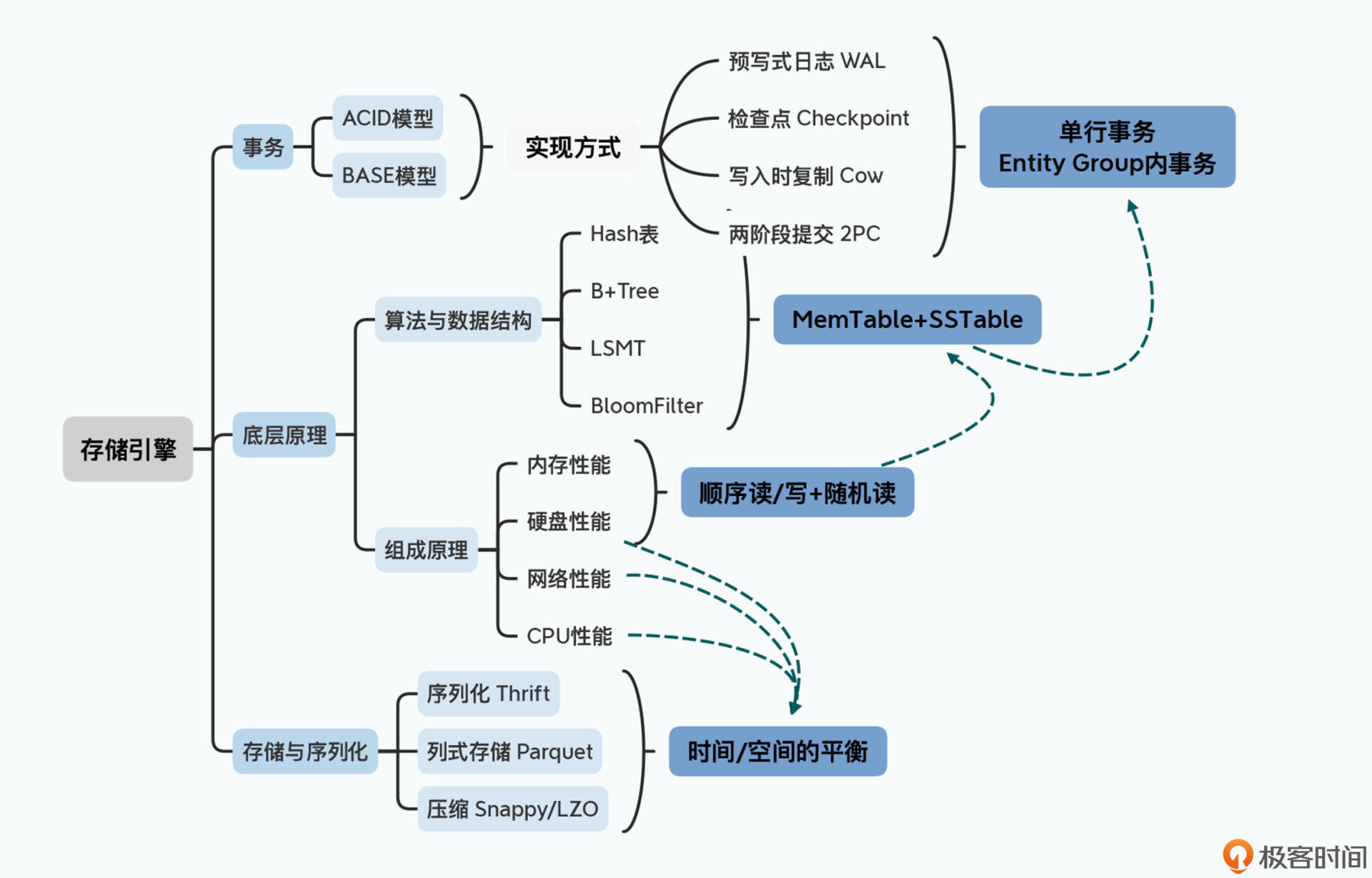 第二个是底层的数据是如何写入和存储的。这个既要考虑到计算机硬件的特性,比如数据的顺序读写比随机读写快,在内存上读写比硬盘上快;也要考虑到我们在算法和数据结构中的时空复杂度,比如Hash表的时间复杂度是O(1),B+树的时间复杂度是O(logN)。