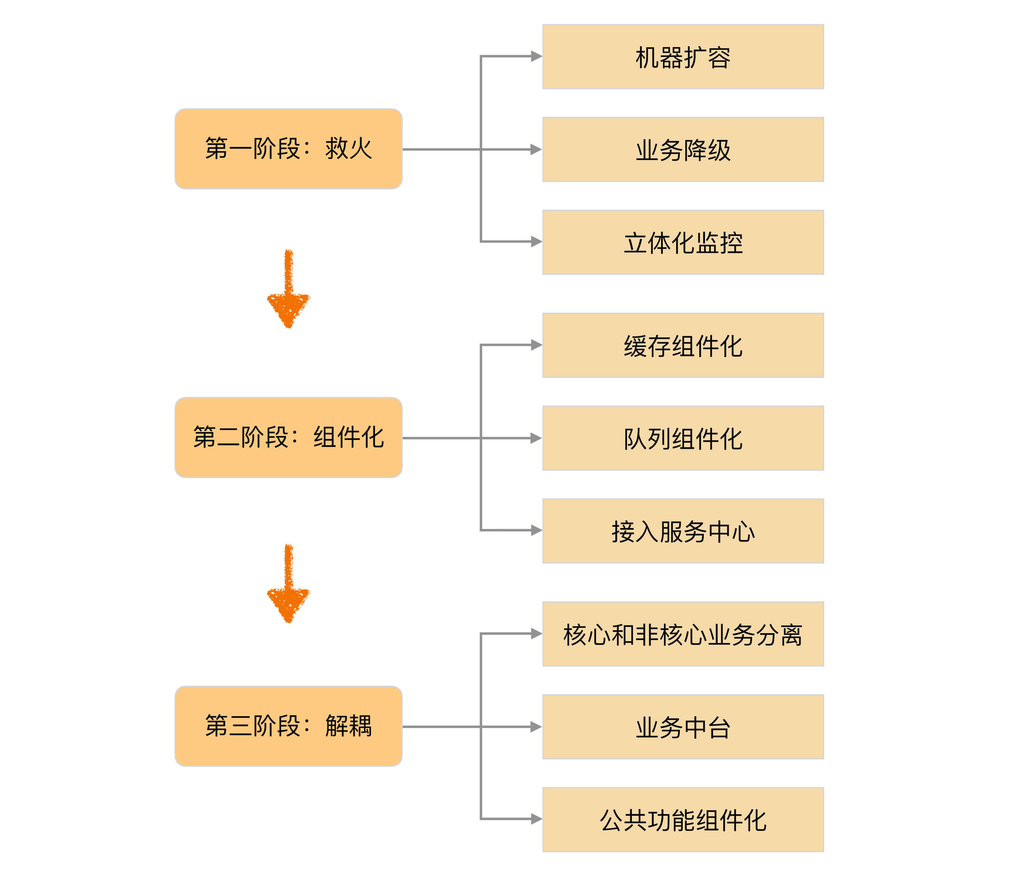可以看到,真正的架构重构在第三阶段,第一阶段和第二阶段都是为了第三阶段做准备而已,但如果没有第一阶段和第二阶段的铺垫,直接开始第三阶段的架构重构工作,架构重构方案需要糅合第一阶段和第二阶段的一些事项(例如,业务降级、接入服务中心等),会导致架构重构方案不聚焦,而且异常复杂。