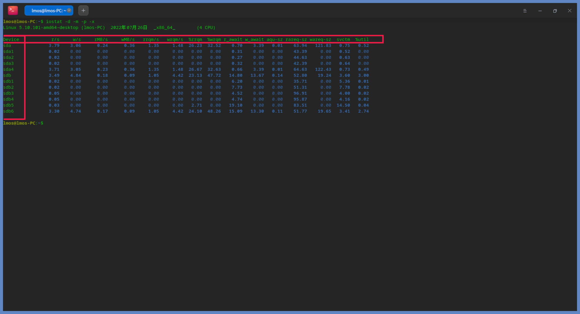 了解了选项,还有个参数我们可能用得上,这个参数可以指定为设备名,比如/dev/sda。如果不带参数,就会默认显示所有IO储存设备的情况。