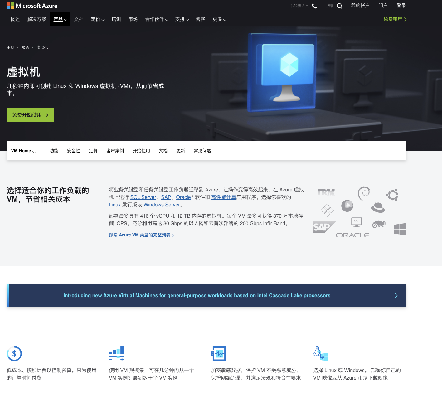 所以,栅格系统本身也是品牌整体感的一部分,我们以微软的Azure的官网为例来讲一下。下图是Azure的云服务器官网,我们会看到,上面部分是简介,下面部分是详情以及功能点,这是一个基本的布局。