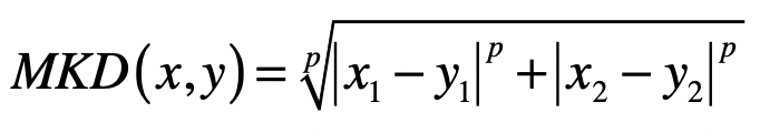 上述三种距离,都可以用一种通用的形式表示,那就是闵可夫斯基距离,也叫闵氏距离。在二维空间中,两个点$x(x_{1},x_{2})$与$y(y_{1},y_{2})$间的闵氏距离是: