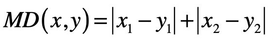 在二维空间中,两个点(实际上就是二维向量)$x(x_{1},x_{2})$与$y(y_{1},y_{2})$间的曼哈顿距离是: