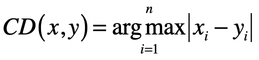 切比雪夫其实是在模拟国际象棋里国王的走法。国王可以走临近8个格子里的任何一个,那么国王从格子$(x_{1},x_{2})$走到格子$(y_{1},y_{2})$最少需要多少步呢?其实就是二维空间里的切比雪夫距离。