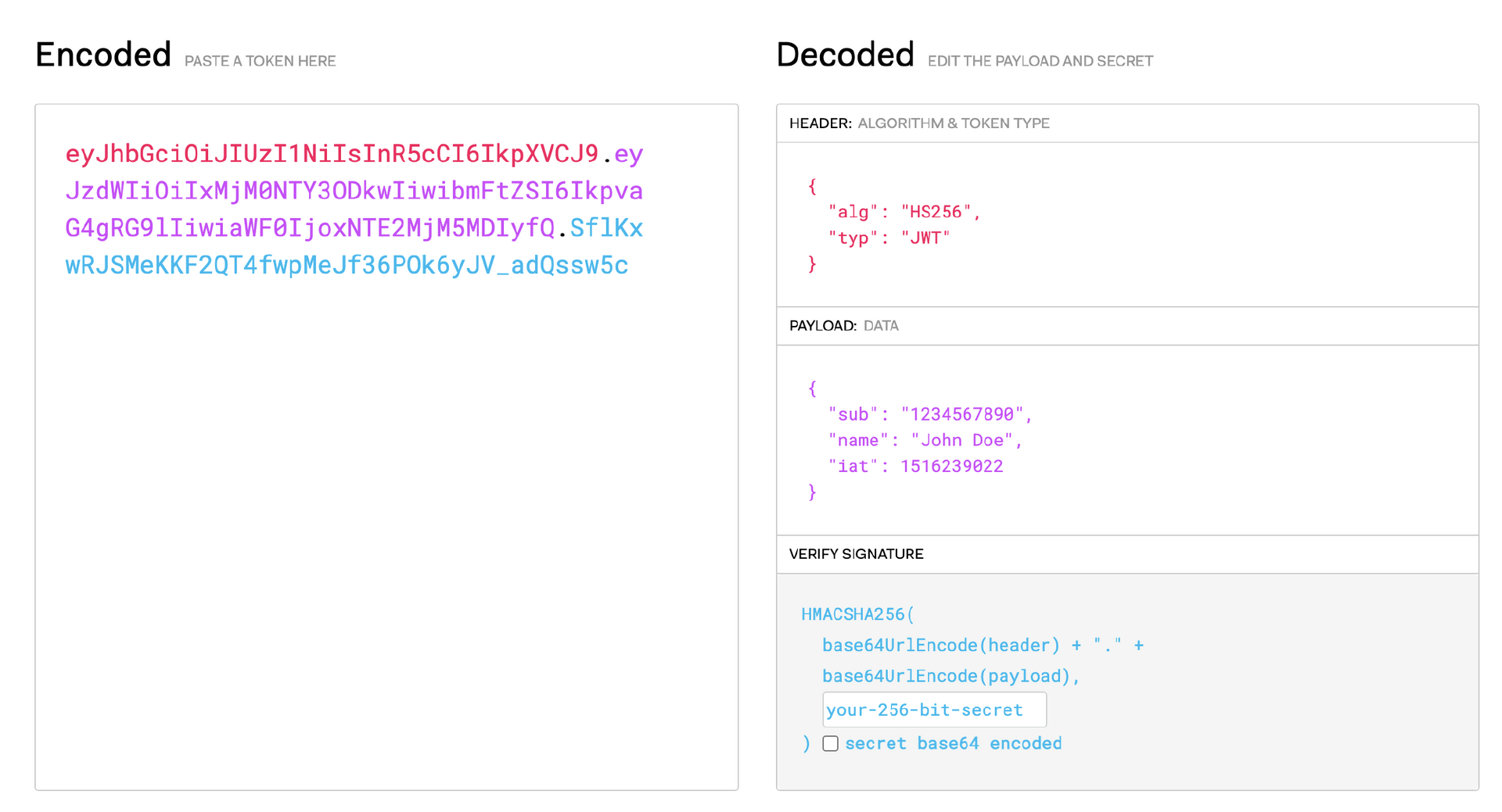 单点登录(SSO) SSO是一种身份验证解决方案,可以让用户通过一次性用户身份验证登录多个应用程序和网站。JWT可以实现单点登录是因为JWT的开销很小,并且能够轻松跨域使用。 信息交换 JWT是一种在各方之间安全传输信息的好方法。因为 JWT 可以使用公钥/私钥对签名进行验证,你可以确定发送者的真实身份。此外,由于签名中包含了具体的内容,因此你还可以验证内容是否被篡改。 我们再来看下JWT的组成。JWT由 Header、Payload、Signature 三个对象组成,正如下面这个演示网站一样,左边为编码后的信息,右边为编码前的三个对象。每个对象都是一个 JSON 结构体。