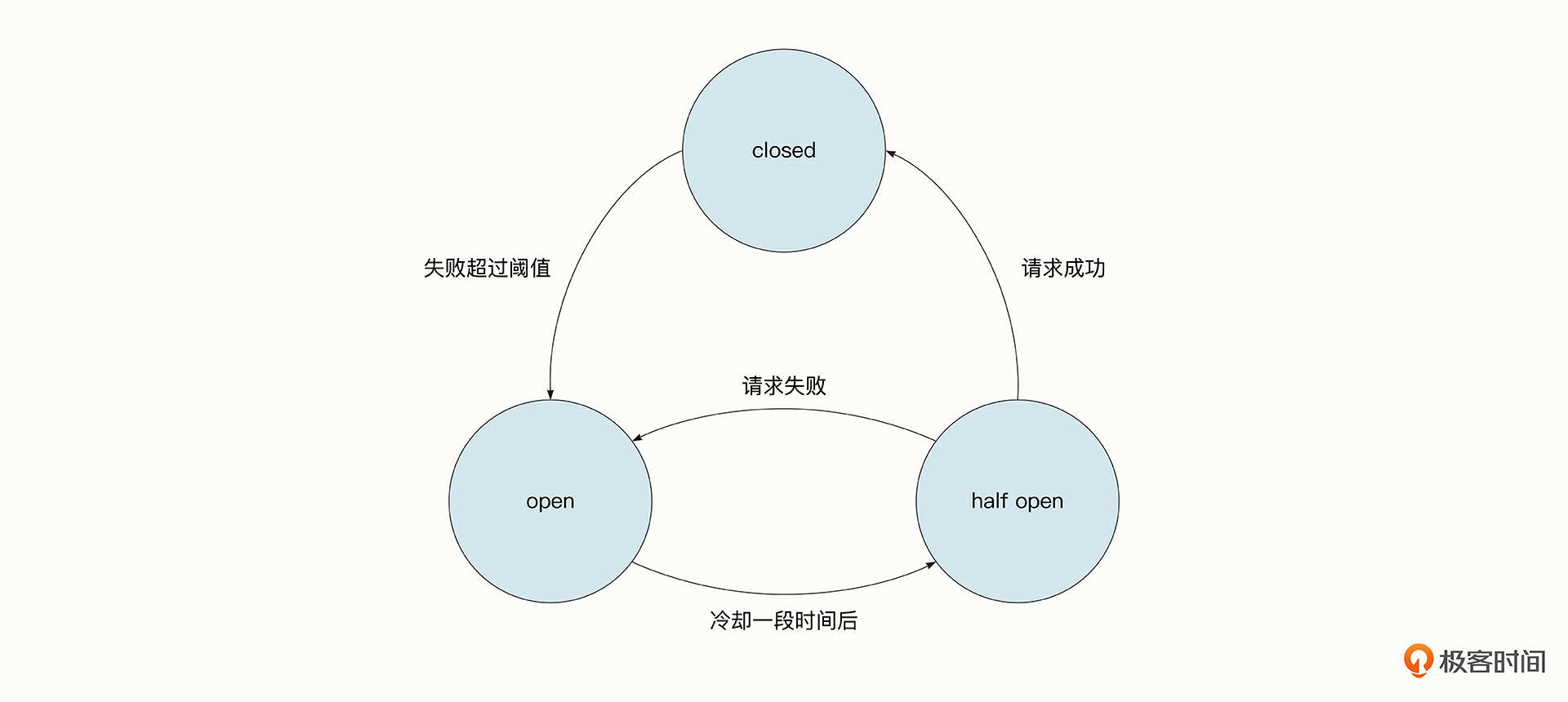 熔断器 实现了限流之后,我们再来看看熔断。我们是通过熔断器来实现熔断的。熔断器是当依赖的下游服务异常时,负责在一段时间内禁止访问依赖服务的一种系统组件,它可以防止有问题的依赖服务拖垮自身系统。熔断器有下面三个状态。