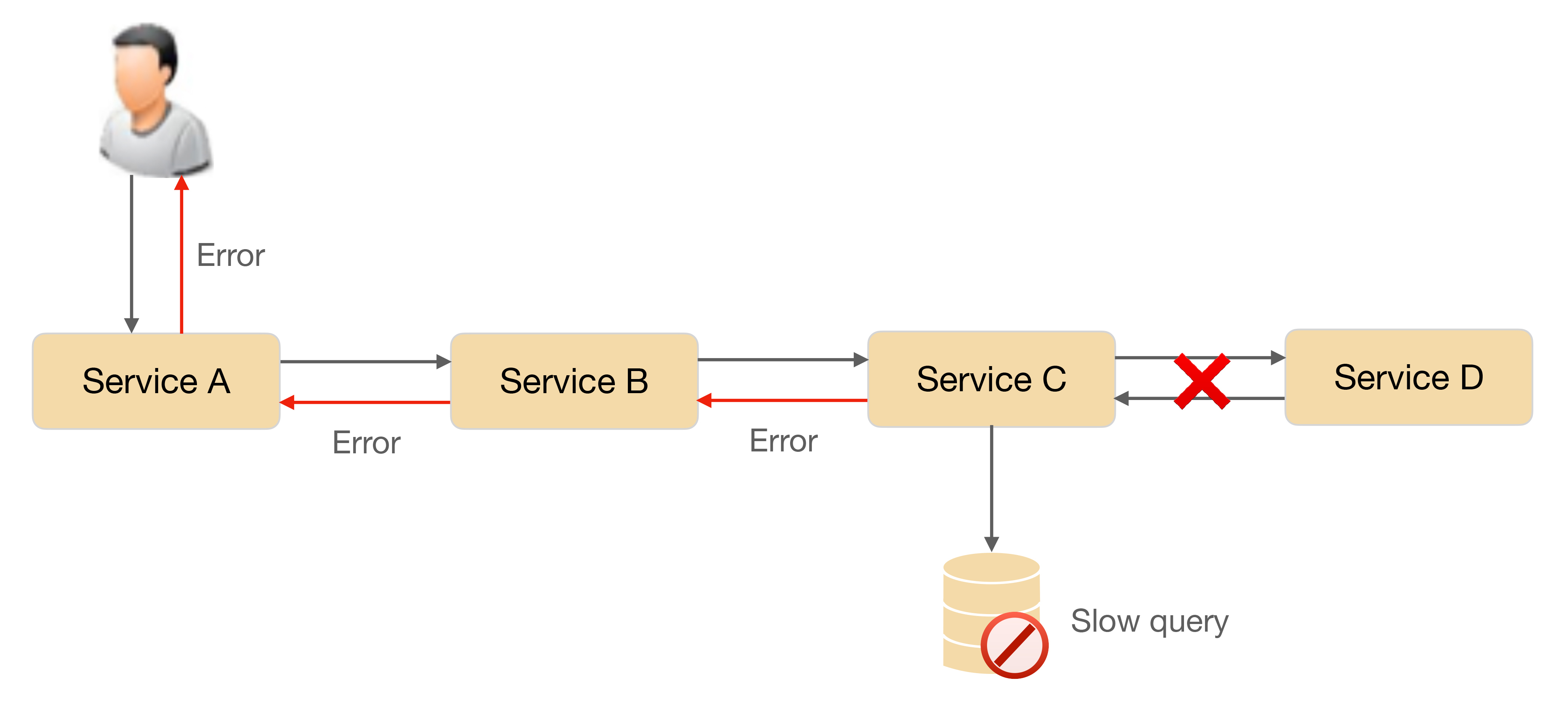 Service C的数据库发生慢查询故障,同时Service C到Service D的网络出现故障,此时到底是哪个原因导致了Service C返回Error给Service B,需要大量的信息和人力去排查。