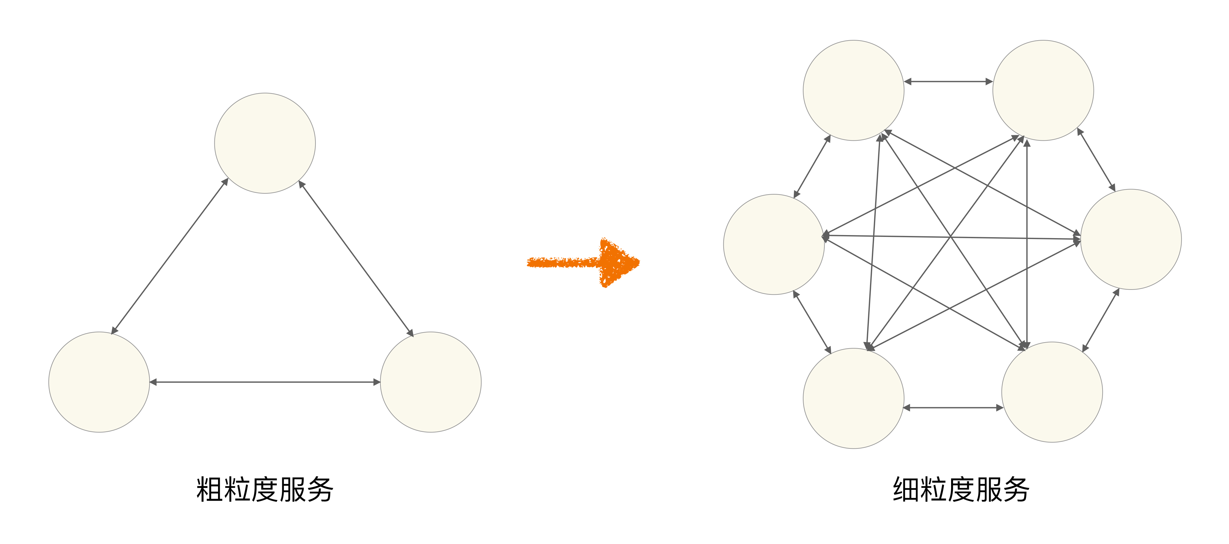 粗粒度划分服务时,系统被划分为3个服务,虽然单个服务较大,但服务间的关系很简单;细粒度划分服务时,虽然单个服务小了一些,但服务间的关系却复杂了很多。
