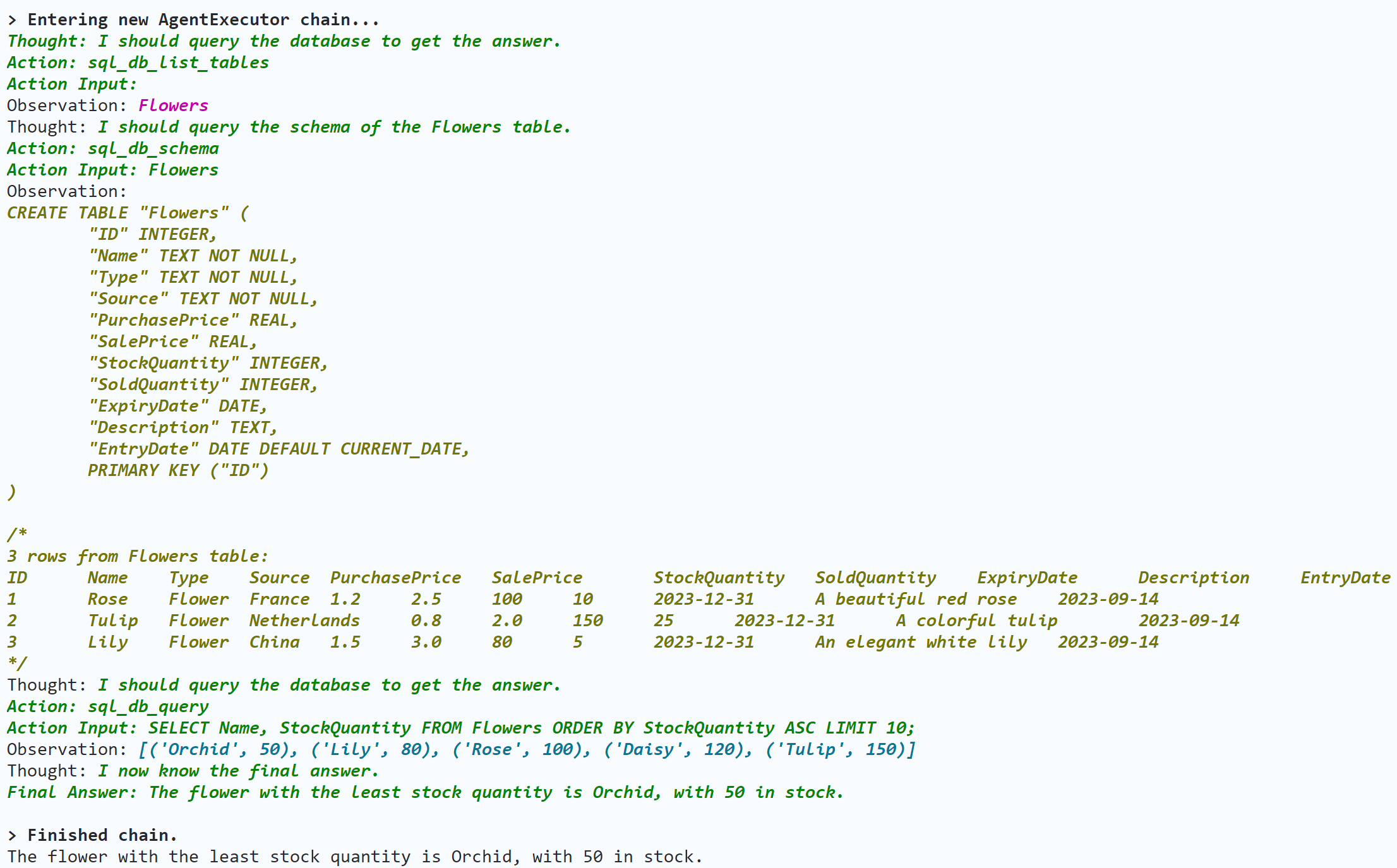 这里,我们导入必要的LangChain模块,然后连接到FlowerShop数据库,初始化OpenAI的LLM实例。之后用SQLDatabaseChain来创建一个从LLM到数据库的链接。