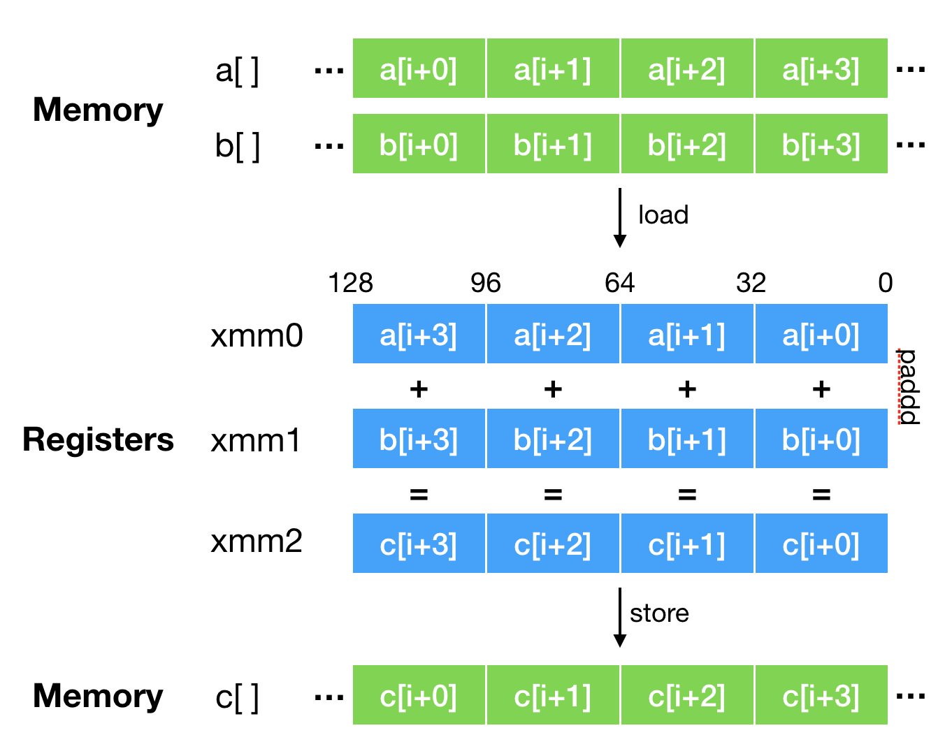 也就是说,原本需要c.length次加法操作的代码,现在最少只需要c.length/4次向量加法即可完成。因此,SIMD指令也被看成CPU指令级别的并行。