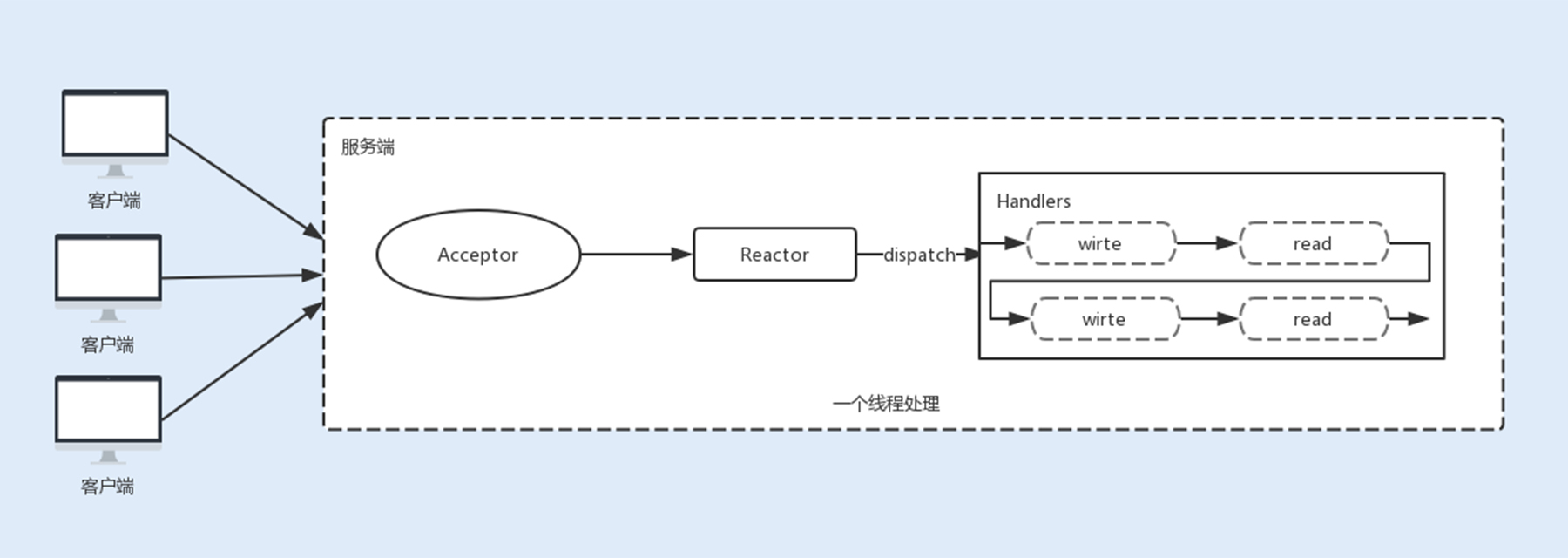 最开始NIO是基于单线程实现的,所有的I/O操作都是在一个NIO线程上完成。由于NIO是非阻塞I/O,理论上一个线程可以完成所有的I/O操作。