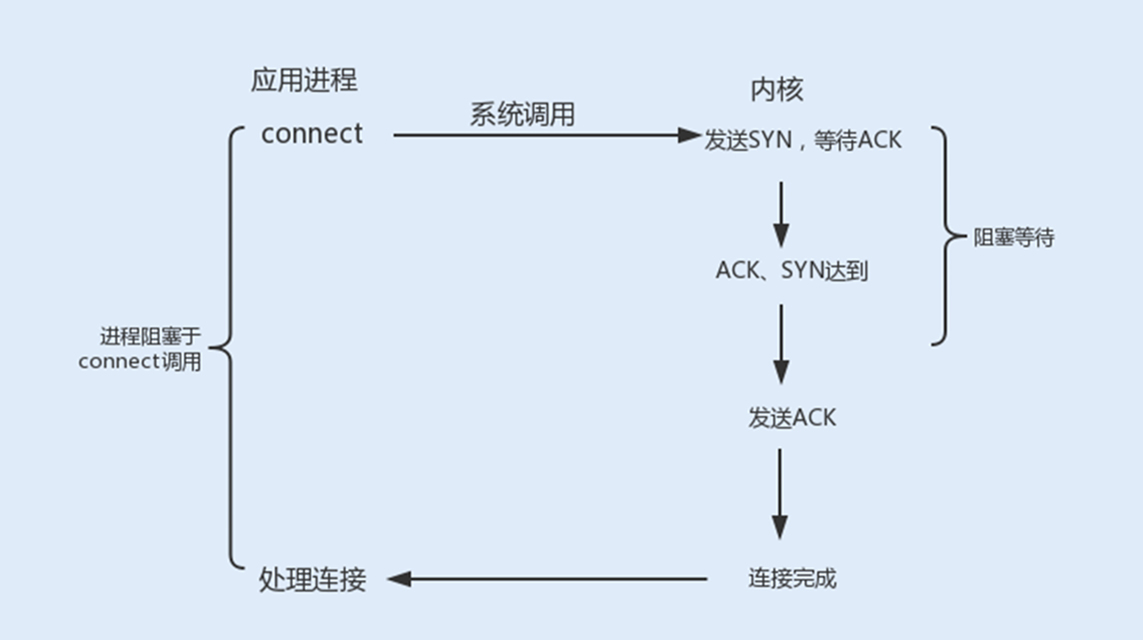 connect阻塞:当客户端发起TCP连接请求,通过系统调用connect函数,TCP连接的建立需要完成三次握手过程,客户端需要等待服务端发送回来的ACK以及SYN信号,同样服务端也需要阻塞等待客户端确认连接的ACK信号,这就意味着TCP的每个connect都会阻塞等待,直到确认连接。