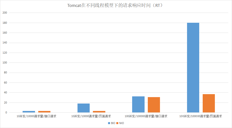 我们可以通过一个性能对比测试来看看在高负载或高并发的情况下,BIO和NIO通信性能(这里用页面请求模拟多I/O读写操作的请求):