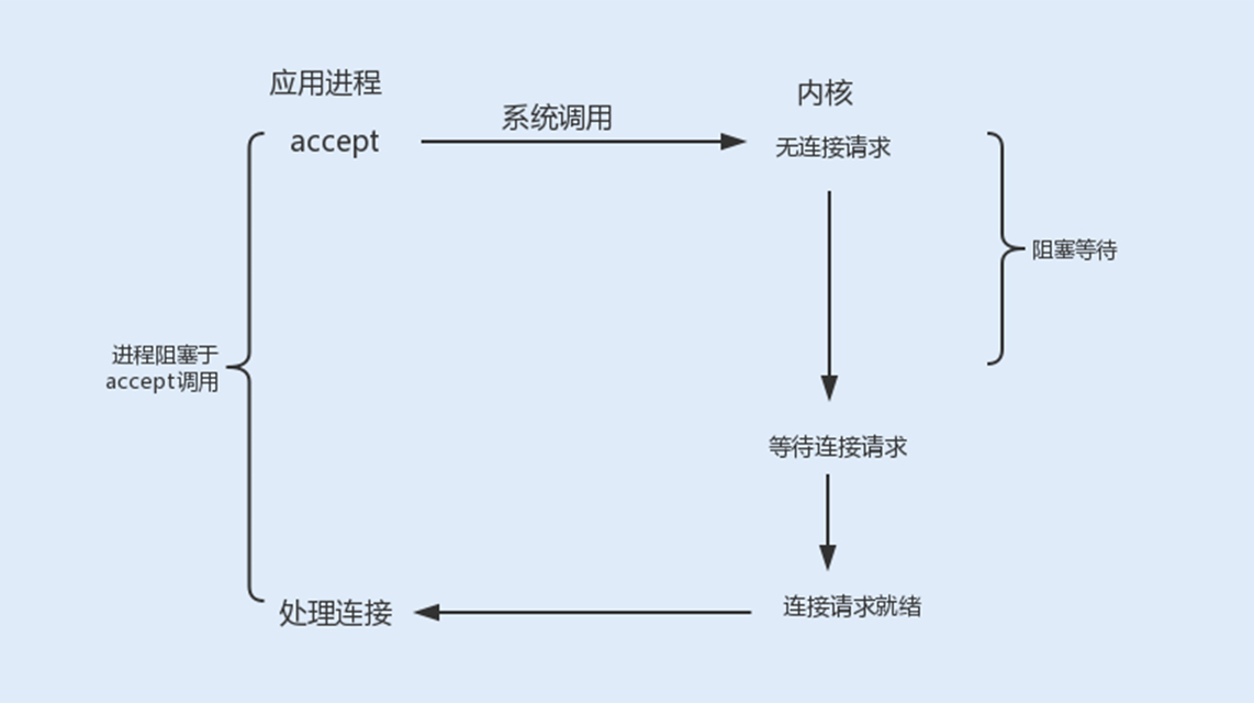 accept阻塞:一个阻塞的socket通信的服务端接收外来连接,会调用accept函数,如果没有新的连接到达,调用进程将被挂起,进入阻塞状态。