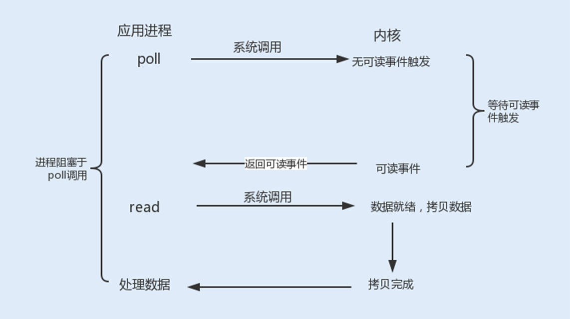 poll() 的机制与 select() 类似,二者在本质上差别不大。poll() 管理多个描述符也是通过轮询,根据描述符的状态进行处理,但 poll() 没有最大文件描述符数量的限制。