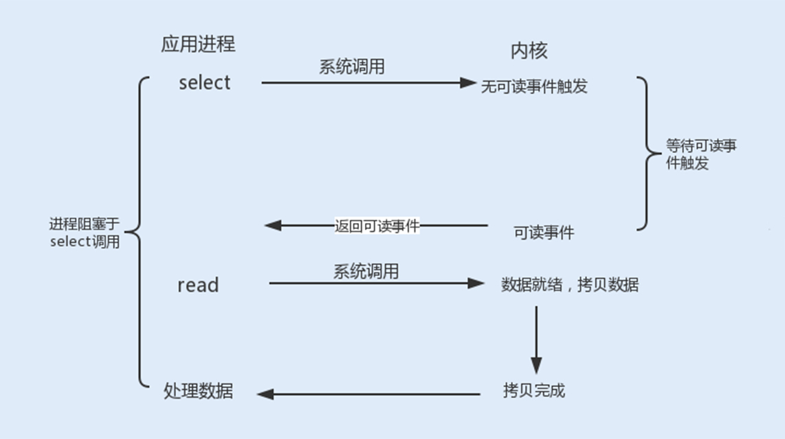 Linux提供了I/O复用函数select/poll/epoll,进程将一个或多个读操作通过系统调用函数,阻塞在函数操作上。这样,系统内核就可以帮我们侦测多个读操作是否处于就绪状态。