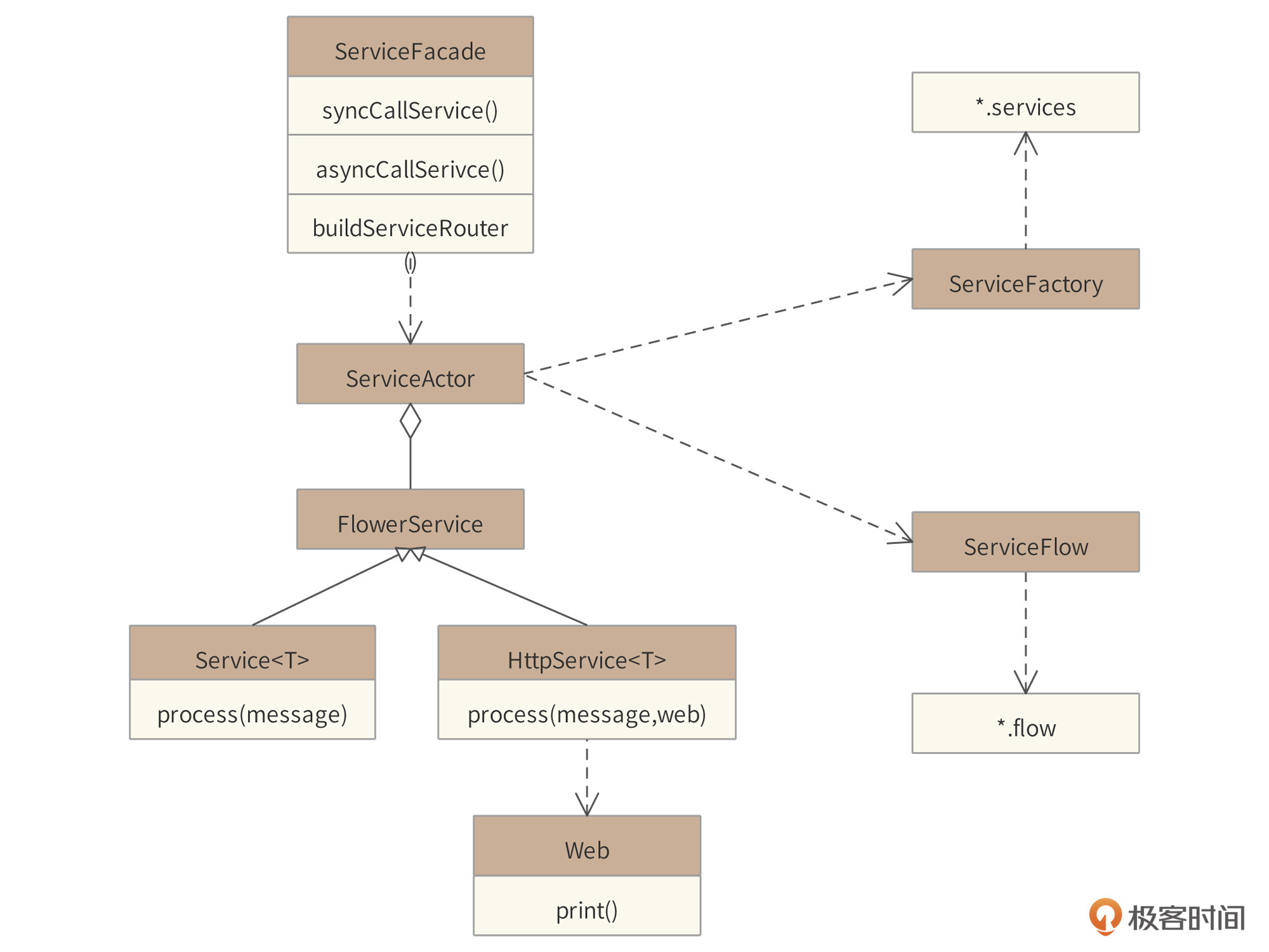 Flower基于Akka的Actor进行开发,将Service封装到Actor里面,并且将Actor收到的消息作为参数传入Service进行调用。