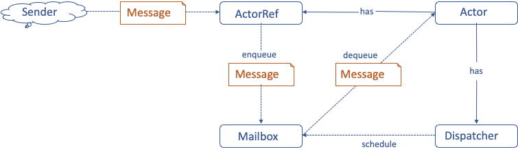 一个Actor向另一个Actor发起通讯时,当前Actor就是一个消息的发送者Sender,它需要获得另一个Actor的ActorRef,也就是一个引用,通过引用进行消息通信。而ActorRef收到消息以后,会将这个消息放到目标Actor的Mailbox里面,然后就立即返回了。
