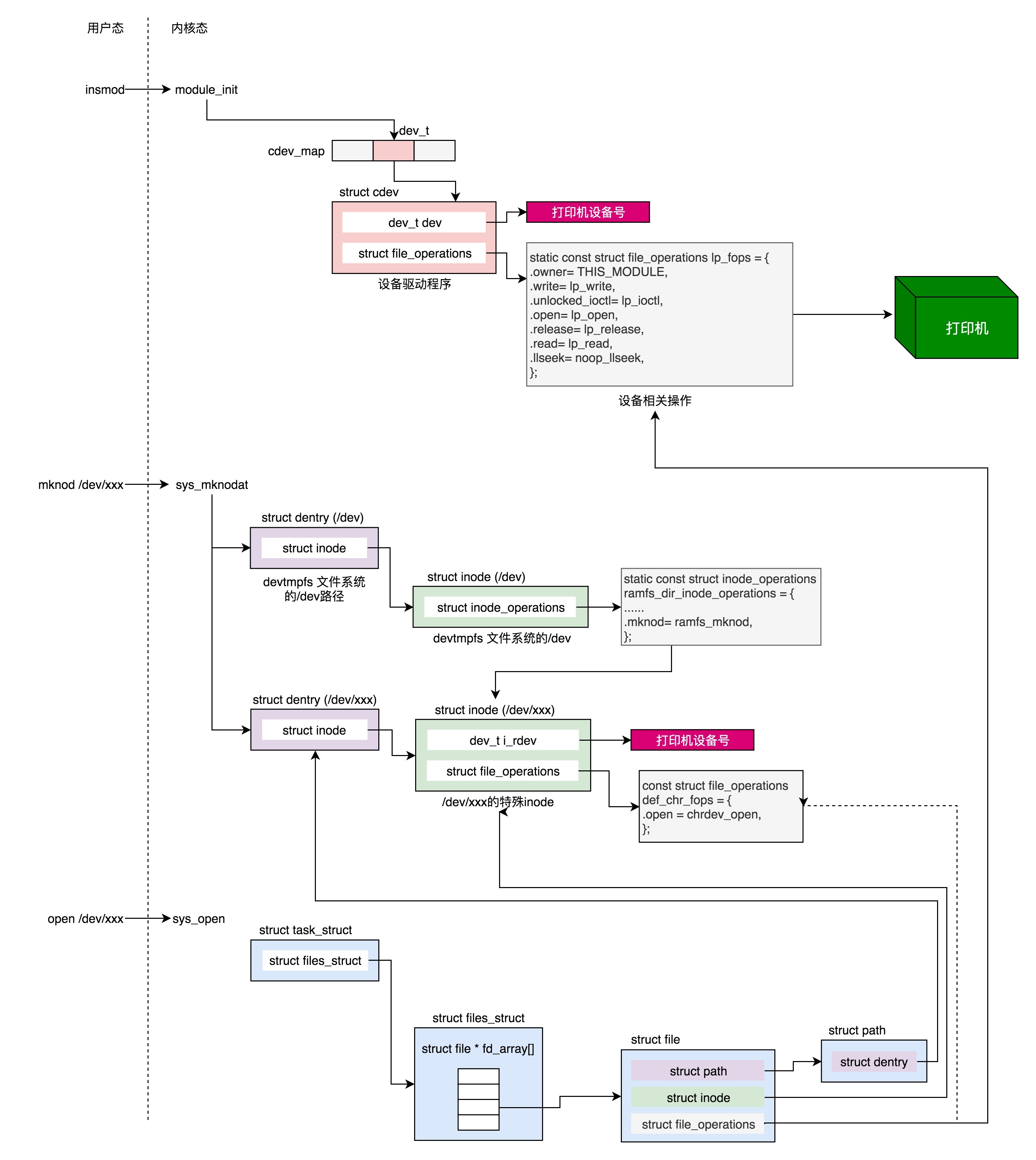 1 2 3 4 5 6 7 8 9 10 11 12 13 14 15 16 17 18 19 20 21 22 23 24 25 26 27 28 29 static int __init lp_init (void) { ...... if (register_chrdev (LP_MAJOR, "lp", &lp_fops)) { printk (KERN_ERR "lp: unable to get major %d\n", LP_MAJOR); return -EIO; } ...... } int __register_chrdev(unsigned int major, unsigned int baseminor, unsigned int count, const char *name, const struct file_operations *fops) { struct char_device_struct *cd; struct cdev *cdev; int err = -ENOMEM; ...... cd = __register_chrdev_region(major, baseminor, count, name); cdev = cdev_alloc(); cdev->owner = fops->owner; cdev->ops = fops; kobject_set_name(&cdev->kobj, "%s", name); err = cdev_add(cdev, MKDEV(cd->major, baseminor), count); cd->cdev = cdev; return major ? 0 : cd->major; }