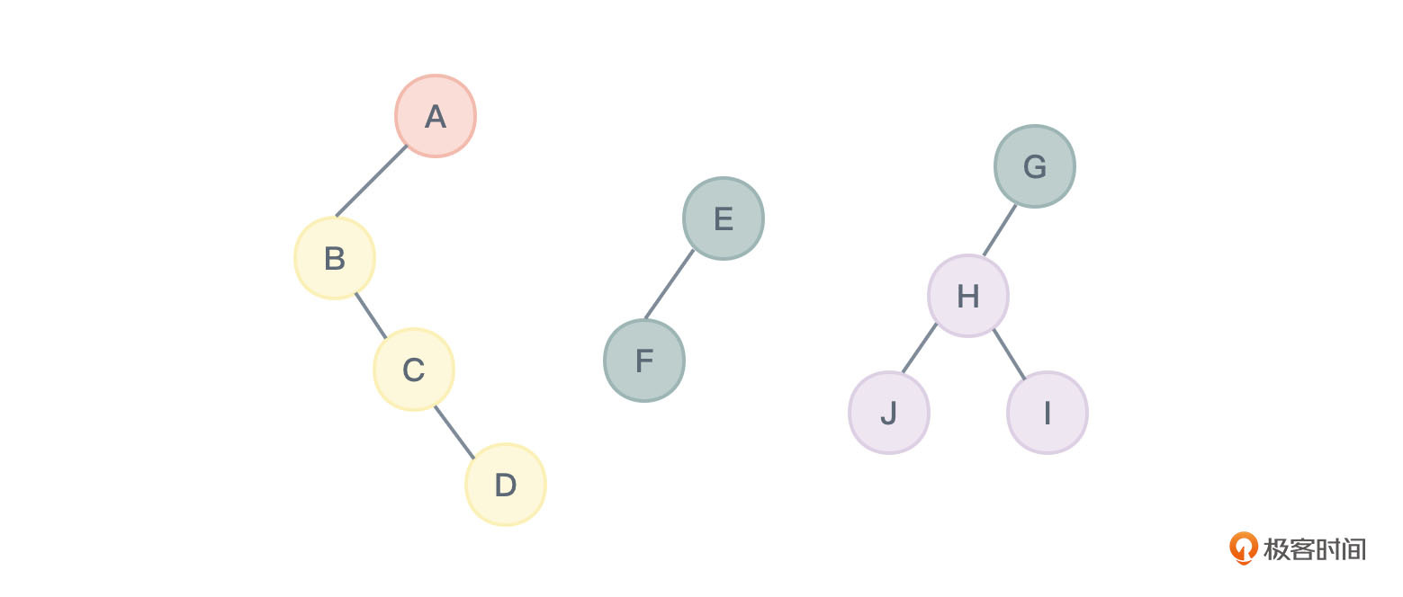- 查看该二叉树的树根是否有右孩子,若有,则把根与右孩子节点的连线删除。这样以这棵右孩子为树根又得到一棵新二叉树,判断该新二叉树的树根是否有右孩子,若有则继续把根与右孩子的连线删除,如此重复下去,就会得到几棵分离的二叉树,如图27所示: