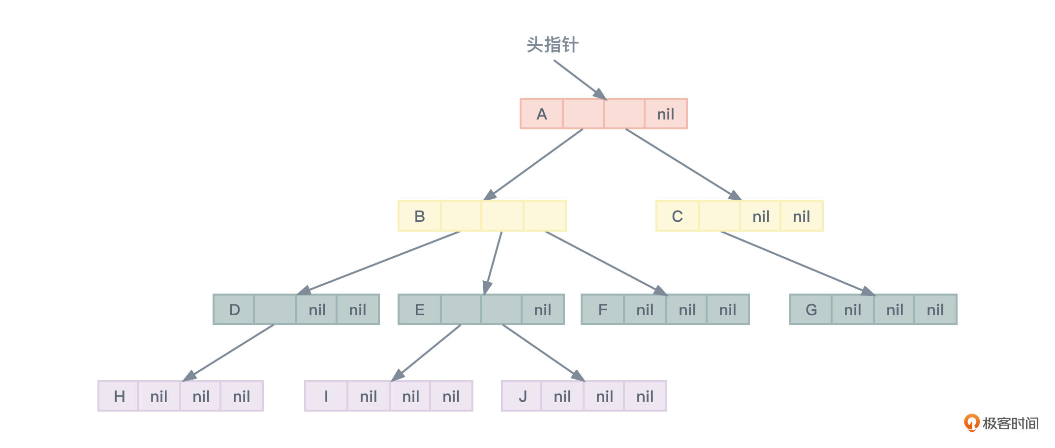 在图7所代表的树度为3,所以指针数组的大小也是3。每个树节点中的1到多个nil标记表示该指针指向空,也就是不指向任何内容。