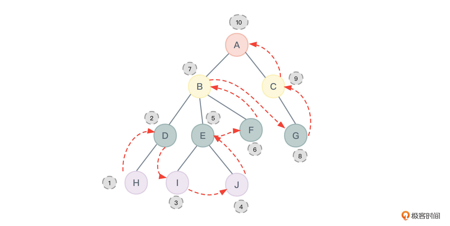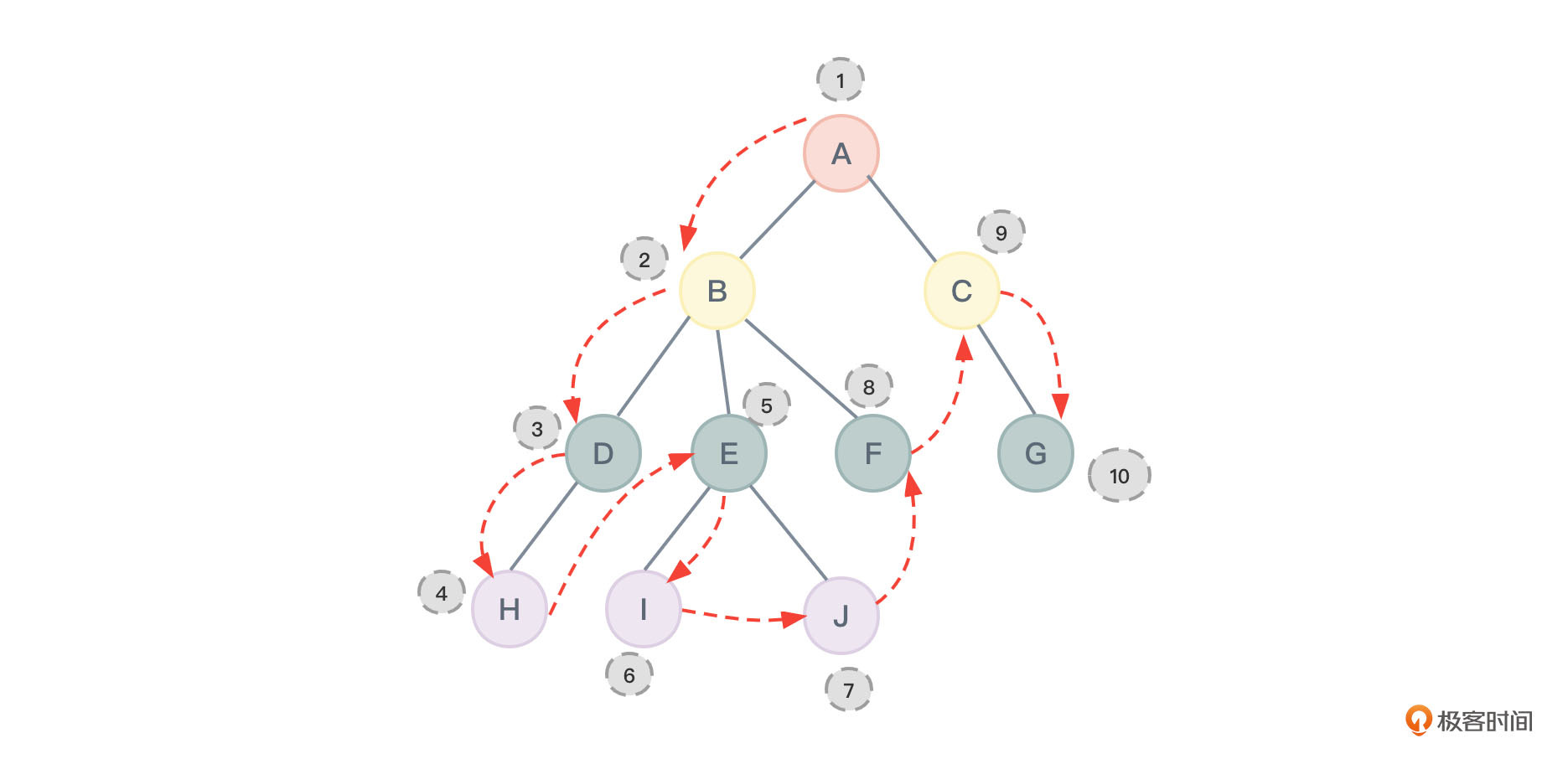 对图2进行层序遍历所得到的结果应该为:ABCDEFGHIJ,节点的访问顺序如图31所示: