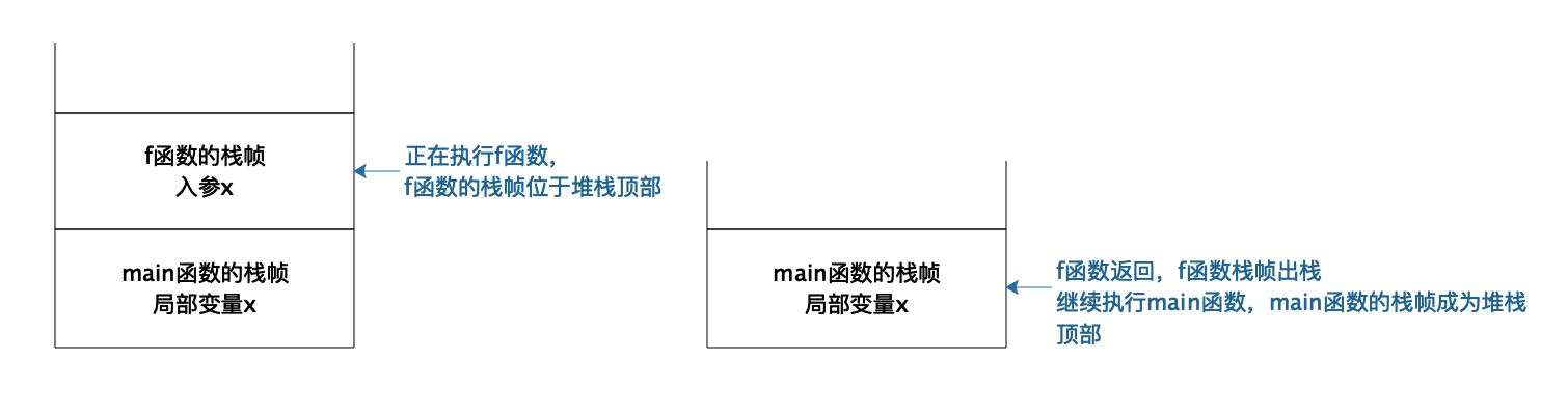程序计数寄存器一开始存放的是main方法的第一行代码位置,JVM的执行引擎根据这个位置去方法区的对应位置加载这行代码指令,将其解释为自身所在平台的CPU指令后交给CPU执行。如果在main方法里调用了其他方法,那么在进入其他方法的时候,会在Java栈中为这个方法创建一个新的栈帧,当线程在这个方法内执行的时候,方法内的局部变量都存放在这个栈帧里。当这个方法执行完毕退出的时候,就把这个栈帧从Java栈中出栈,这样当前栈帧,也就是堆栈的栈顶就又回到了main方法的栈帧,使用这个栈帧里的变量,继续执行main方法。这样,即使main方法和f方法都定义相同的变量,JVM也不会弄错。这部分内容我们在第一篇已经讨论过,JVM作为一个machine,和操作系统的处理线程栈的的方法是一样的。
