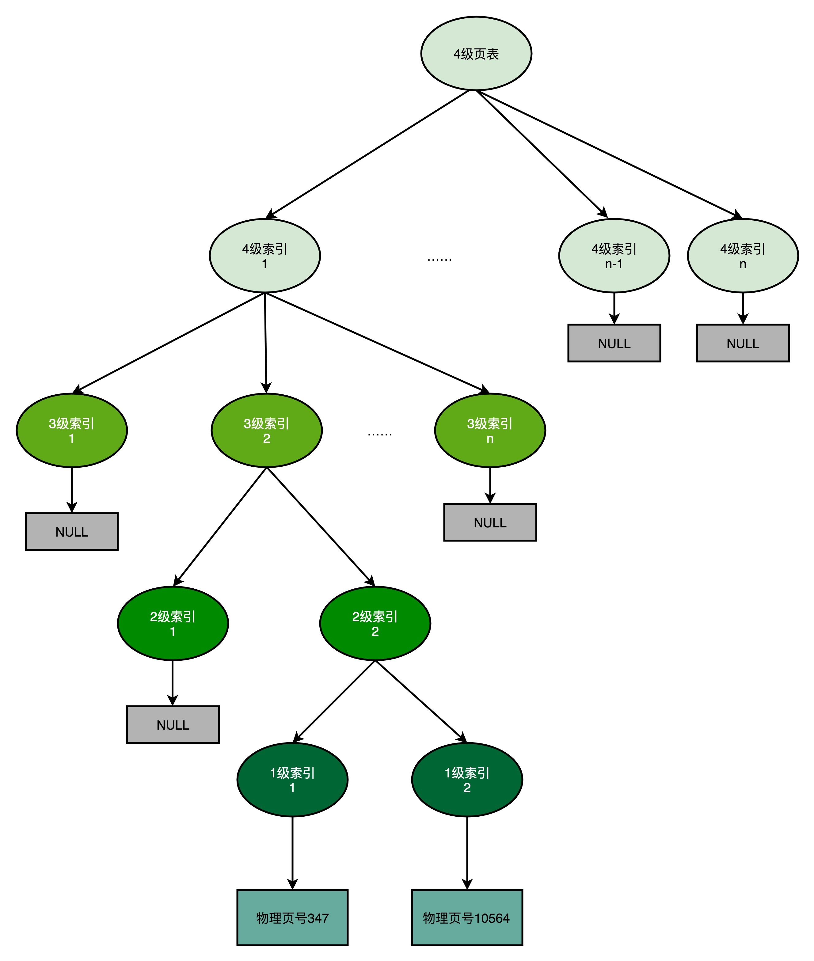 我们可能有很多张1级页表、2级页表,乃至3级页表。但是,因为实际的虚拟内存空间通常是连续的,我们很可能只需要很少的2级页表,甚至只需要1张3级页表就够了。
